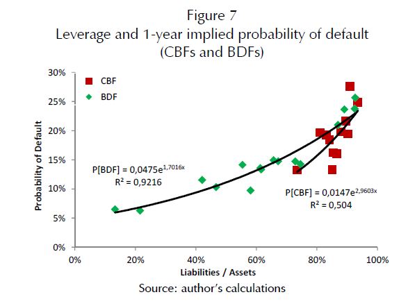probabilities are non-negligible, where the ratio of default-probability-to-leverage is lower for