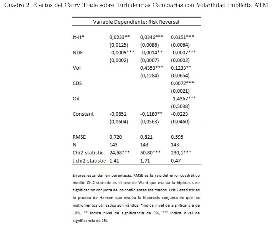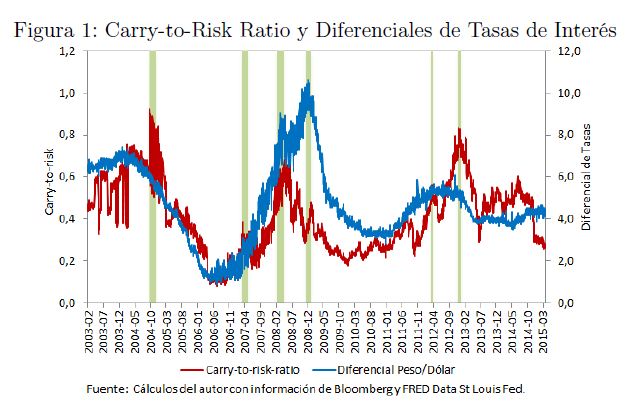 El carry trade de monedas es una estrategia de inversión ampliamente utilizada por especuladores en la cual el inversionista se endeuda en una divisa con baja tasa de interés (moneda de fondeo) e invierte ese dinero en una divisa con alta tasa de interés (moneda destino). El objetivo de este trabajo es evaluar si el carry-to-risk-ratio como medida de incentivos de carry trade es un indicador apropiado para identificar este tipo de estrategias de inversión en el mercado cambiario colombiano. Igualmente, se estudia si los diferenciales de tasas de interés entre Colombia y Estados Unidos observados en los últimos años pudieron generar movimientos bruscos en el tipo de cambio o lo que se denomina en la literatura currency crash risk. Usando el indicador carry-to-risk-ratio, se encuentra evidencia para Colombia que agentes no residentes podrían haber efectuado operaciones carry trade en 2007, 2008 y 2012. Mediante regresiones de variables instrumentales y modelos vectoriales autorregresivos (VAR) se encuentra evidencia de que altos diferenciales de tasas de interés están estrechamente relacionados con episodios de turbulencia cambiaria en Colombia.
