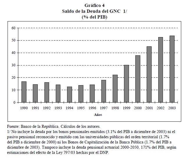 | dc.description | Después de la ejecución del programa de ajuste fiscal y macroeconómico aplicado entre 1999 y 2002, y de las medidas económicas tomadas por la actual administración, se conoce que el país no se encuentra aún sobre una senda fiscal sostenible. Este documento recapitula integralmente el problema de las finanzas del gobierno y plantea algunas recomendaciones en materia de ingresos, gastos y deuda, con el fin de sanearlas y hacerlas sostenibles en el mediano y largo plazo. Haciendo un reconocimiento a los esfuerzos que han hecho las anteriores administraciones y la actual, el documento contribuye al debate que busca la adopción de nuevas y efectivas decisiones de política fiscal. | spa |
