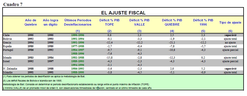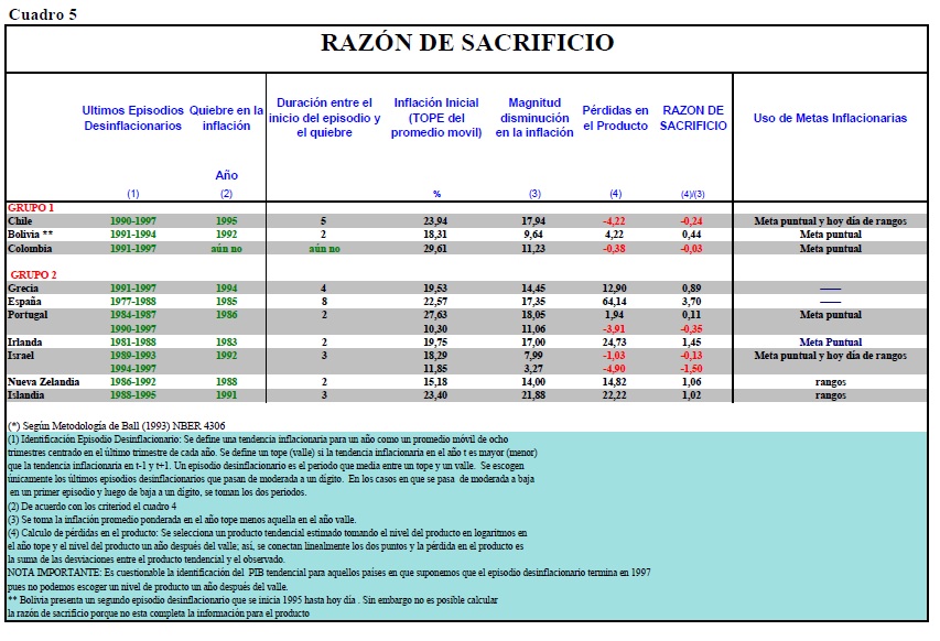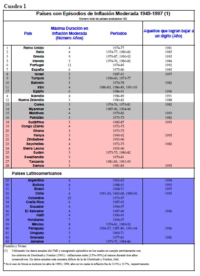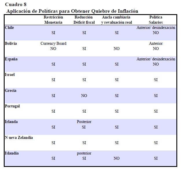 En el presente artículo se analizan las políticas desinflacionarias utilizadas para lograr el paso de inflación moderada a inflación de un dígito en 9 países cuya estructura es semejante a la colombiana y cuyo éxito desinflacionario ha sido sostenible. Estos son : Chile, Bolivia, Grecia, España, Portugal, Irlanda, Israel, Nueva Zelandia e Islandia. Además, para cada uno se utilizan dos criterios de análisis: se identifica un episodio desinflacionario (según metodología de Ball) y se selecciona un año de quiebre en la inflación (según definición de los autores); así, se evalúa el comportamiento de políticas económicas durante el episodio desinflacionario, y antes y después del quiebre. Las políticas evaluadas son : control monetario, contracción de los salarios reales, disminución del déficit fiscal y revaluación del tipo de cambio. También se mide el costo de desinflar en términos del crecimiento del producto. Así mismo, se rozan aspectos de desarrollo institucional importantes en el logro de inflaciones bajas. Se compara el caso colombiano con respecto a estas políticas y se trata de responder porqué Colombia no ha logrado un dígito.