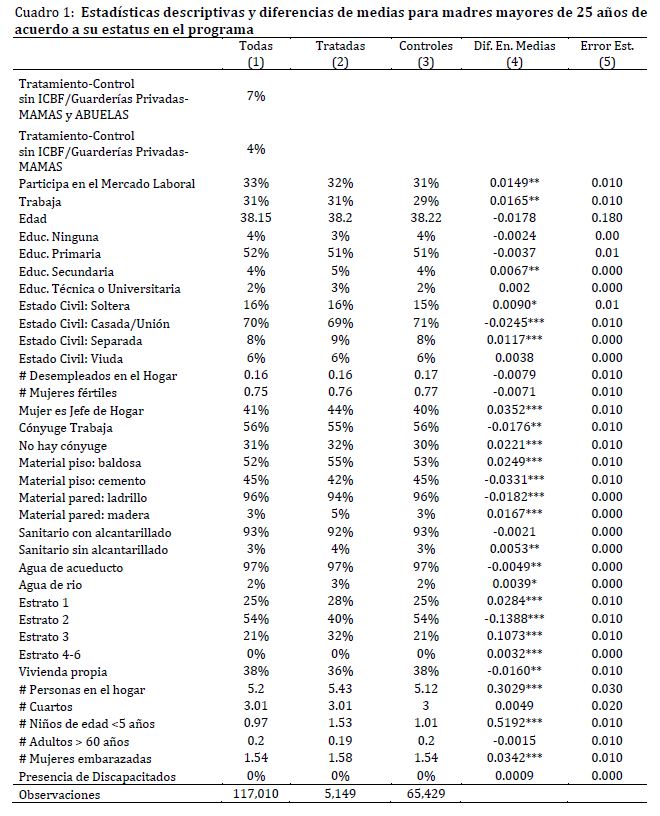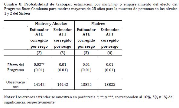 Este artículo evalúa el efecto de los centros de cuidado infantil sobre la participación laboral y la empleabilidad de madres de menores de cinco años. Con este fin, se analiza la provisión pública de los centros de cuidado provistos por el Gobierno de la ciudad de Medellín a través de su programa de atención integral a la primera infancia, Buen Comienzo. En la llamada modalidad institucional, Buen Comienzo atiende sin costo alguno durante ocho horas diarias y cinco días a la semana a niños y niñas menores de cinco años de edad. Este servicio reduce el costo que representa para las madres el cuidado infantil, el cual influye en la asignación de su tiempo entre el mercado de trabajo y el hogar. El menor costo genera un efecto sustitución positivo entre trabajo y ocio a favor de la decisión de trabajar. Para estimar la magnitud del efecto, se utilizan dos metodologías no experimentales, la de emparejamiento o matching y la de variables instrumentales. Con la primera se estima el efecto promedio y con la segunda el efecto local del programa. Los resultados sugieren que la modalidad de cuidado infantil del programa Buen Comienzo ha incrementado en promedio entre tres y nueve puntos porcentuales (o entre 10% y 27%), la probabilidad que tienen las madres con hijos menores de participar en el mercado de trabajo. Para las madres ubicadas cerca de los centros de cuidado el efecto es 05r, o de 31 puntos porcentuales, que equivale a duplicar su probabilidad de participar en el mercado laboral. En materia de empleabilidad, sin embargo, el efecto es mínimo.