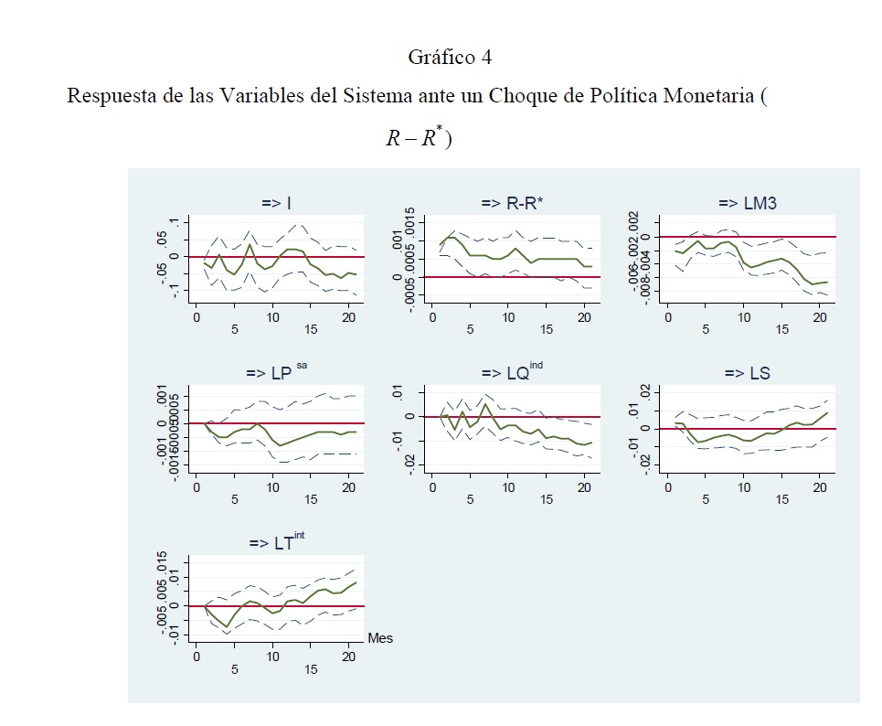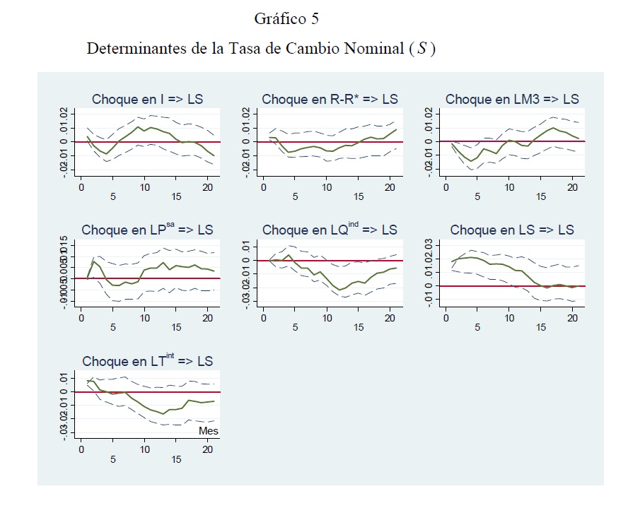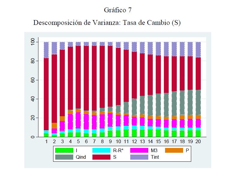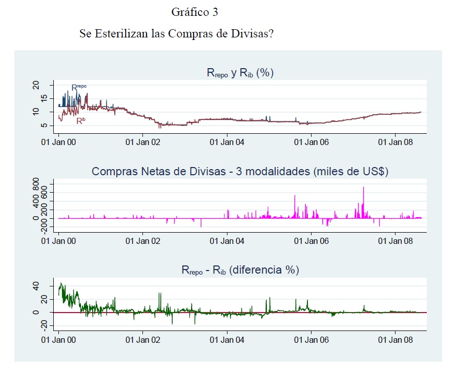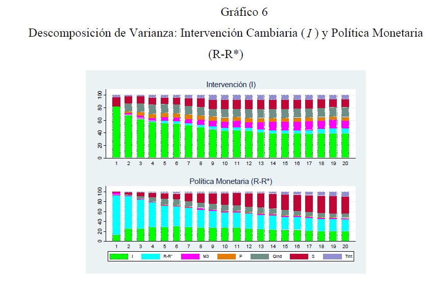 Se utiliza la metodología VAR estructural para evaluar el impacto conjunto de las intervenciones cambiarias y de la política monetaria convencional sobre la tasa de cambio, la tasa de interés y las demás variables del sistema. Se encuentra que las compras netas de divisas devalúan significativamente la tasa de cambio nominal durante un período cercano a 1 mes, en parte debido a que las compras no han sido esterilizadas en su totalidad, y a que han anunciado una política monetaria expansiva en el futuro (el llamado canal de signaling). Ello plantea conflictos potenciales de política en un régimen de inflación objetivo. La tasa de cambio nominal aparece determinada con igual fuerza por variables nominales y reales. No se encuentra evidencia de la paridad no cubierta, quizá por la incapacidad de capturar adecuadamente variables como el riesgo y las expectativas de tasa de cambio y de precios.