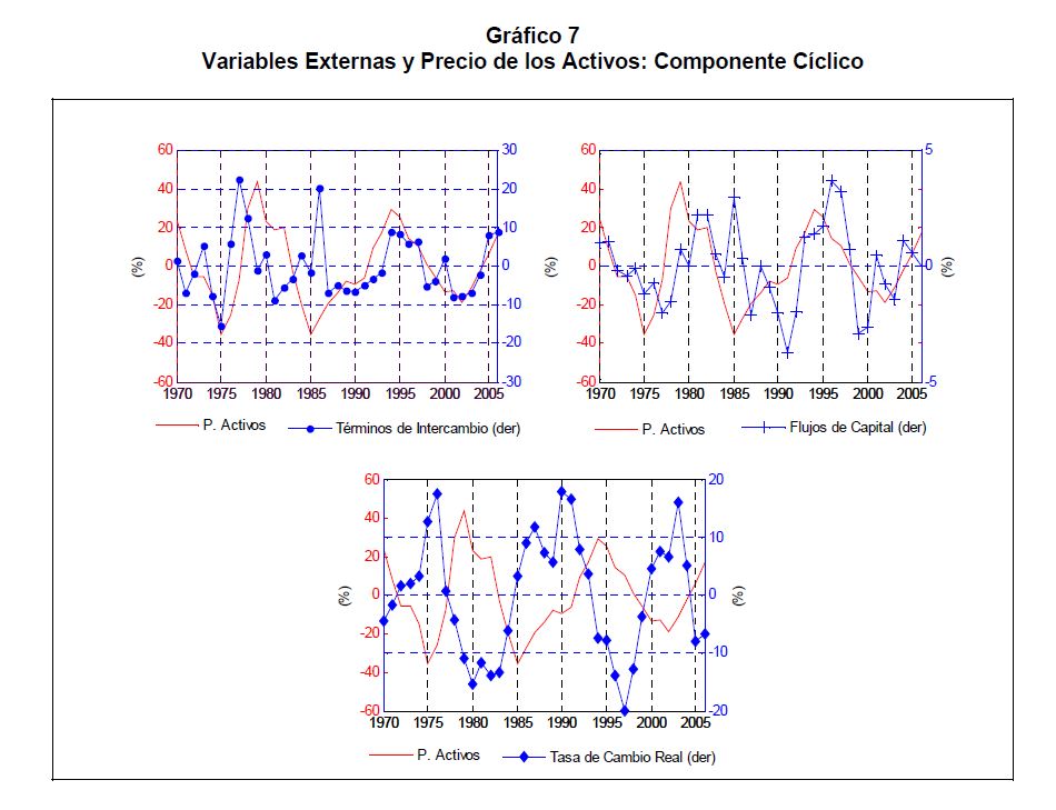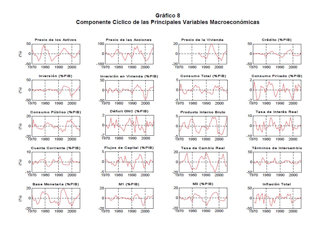 A partir del debate sobre la respuesta de política a fluctuaciones en los precios de los activos, en el presente documento se estudia la importancia de estos precios en el contexto de una economía emergente como la colombiana, caracterizada por un grado variable de represión financiera y vulnerabilidad a choques externos, en particular de flujos de capital y términos de intercambio. El trabajo encuentra evidencia sobre el funcionamiento del acelerador financiero y su relación con dichos choques en el período 1970 ? 2006. A partir de allí se identifican tres ciclos de precios de los activos que coinciden con ciclos del PIB. Los resultados subrayan la incidencia de choques externos y del diseño macroeconómico de la política monetaria en la dinámica del acelerador financiero. Esto corrobora la importancia de variables como los precios de los activos y el crédito para el diseño de una política monetaria contra-cíclica.