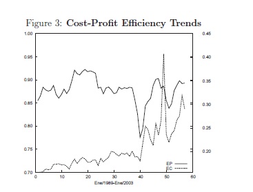 In this paper we discuss cost and profit efficiency for a sample of financial institutions on the Colombian financial market in the period 1989-2003, using stochastic frontier efficiency analysis. During the period, the cost efficient frontier deteriorate