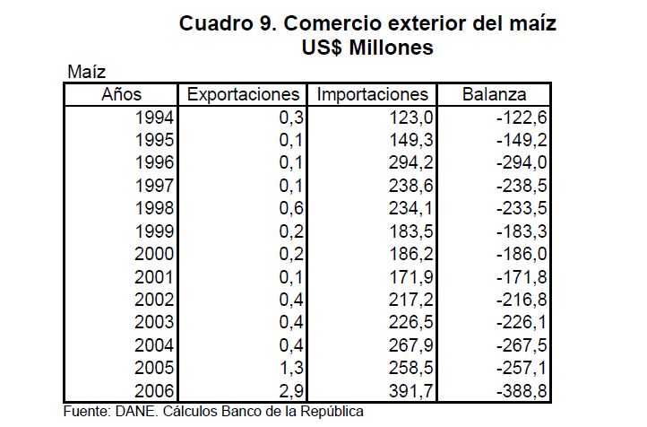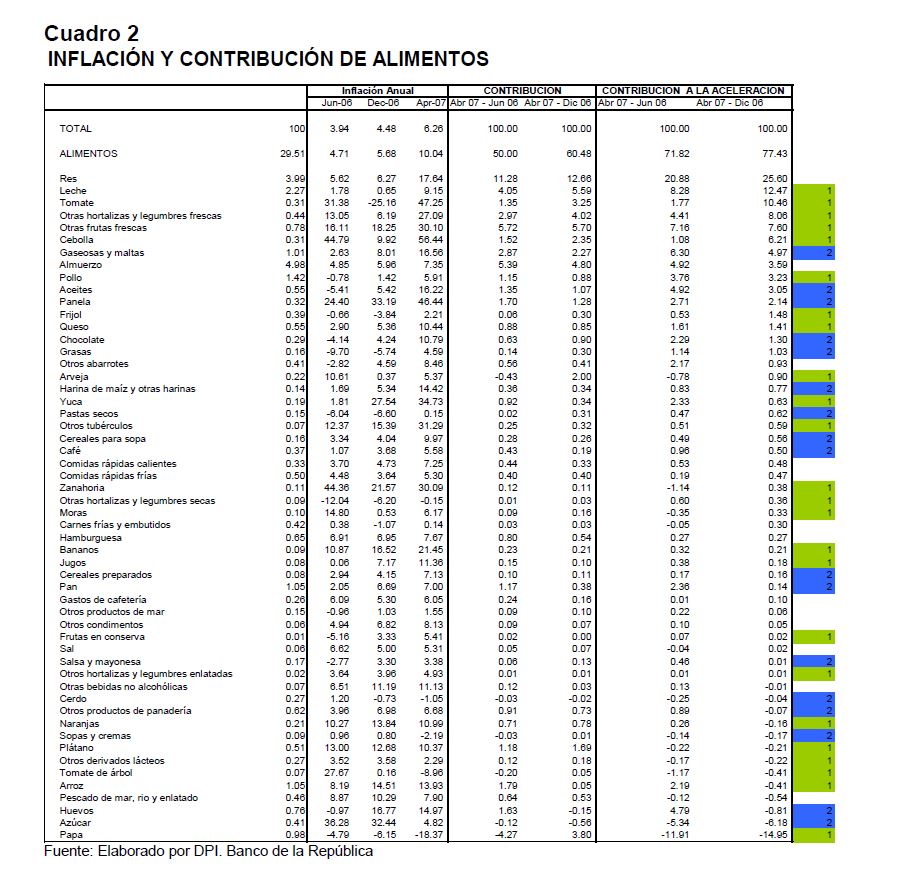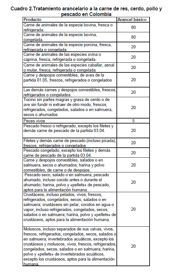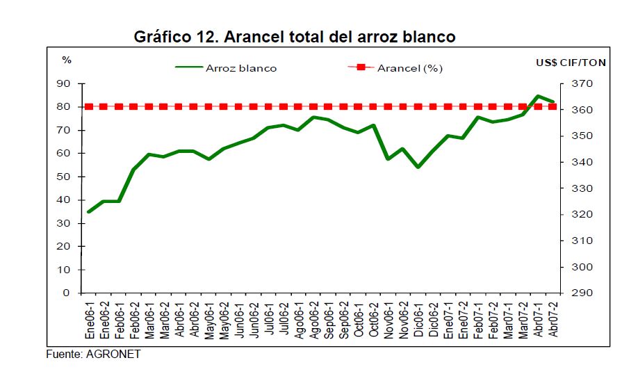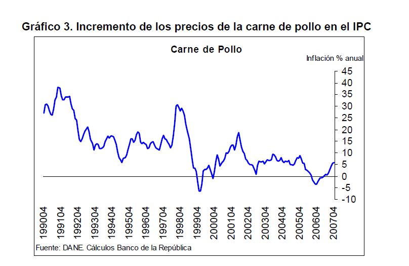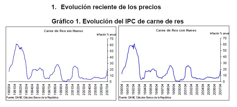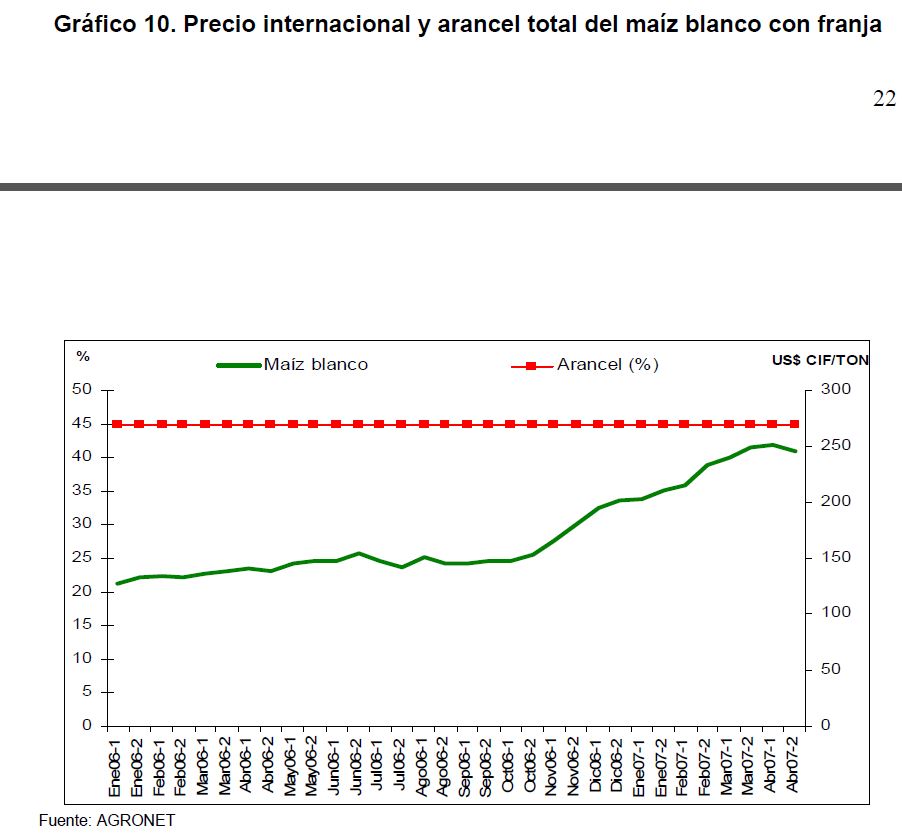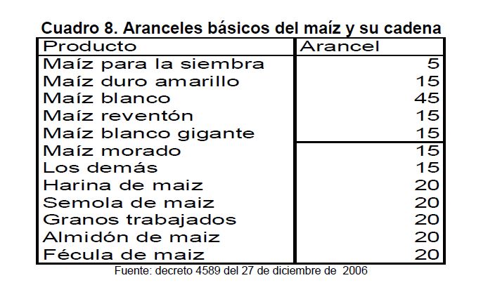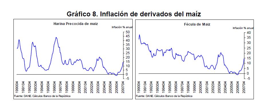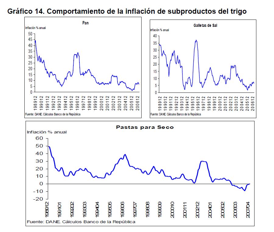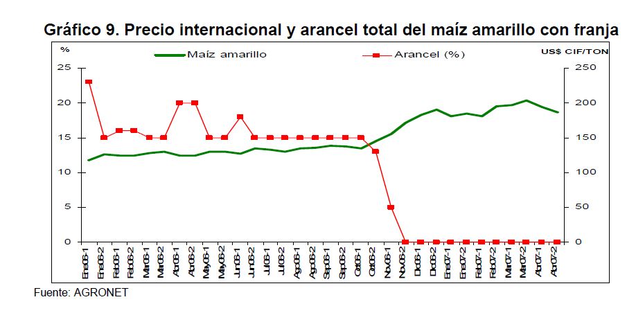 En la actual coyuntura inflacionaria, gran parte del aumento de los precios al consumidor puede atribuirse al comportamiento de los precios de los alimentos, siendo esta la 05r sorpresa en materia de inflación en los primeros meses de 2007. Pueden caracterizarse como factores de oferta y demanda los que han contribuido a acelerar la inflación de los alimentos en la actual coyuntura. Entre los elementos de demanda cabe mencionar: 1) el gran aumento las ventas de alimentos a Venezuela; 2) la aceleración de la demanda interna en Colombia y 3) el crecimiento de los precios internacionales de algunos productos susceptibles de ser transformados en bio-combustibles. Estos factores han coincidido con elementos de oferta como una nueva aparición del Fenómeno de El Niño y el inicio de la fase de retención del ciclo ganadero. La demanda mundial por los productos susceptibles de convertirse en energéticos sin duda ha sido otro elemento que ha presionado a los precios de algunos bienes agrícolas. Esto no ha ocurrido solo en Colombia sino que ha afectado a otros países. En los próximos años este factor tendrá un efecto directo sobre la inflación mundial al consumidor. Este fenómeno de los biocombustibles, junto con el cambio climático y la gran demanda de China e India, amenazan con que la inflación de alimentos se generalice a nivel mundial a niveles sin precedentes y se convierta en un fenómeno más estructural que meramente cíclico. Dentro de las alternativas de solución que se han venido planteando, una de ellas ha sido una revisión de la política comercial en materia de productos agrícolas y agroindustriales en Colombia. Una rebaja de la protección permitiría asegurar un abastecimiento adecuado de estos bienes, o por lo menos en aquellos períodos en que se prevé escasez que pueda llevar a un aumento prolongado de sus precios. Este tipo de política podría contribuir a una morigeración de estas tendencias. Esta revisión podría ser temporal o permanente de acuerdo con lo que se estima dure el choque en cada producto. En este documento se presenta un análisis de las políticas comerciales que cobijan actualmente a algunos de los productos cuyo comportamiento de los precios ha incidido de manera significativa en la inflación de los últimos meses: carne bovina y de pollo, leche, maíz, arroz y sus subproductos, aceites vegetales y trigo y sus subproductos.