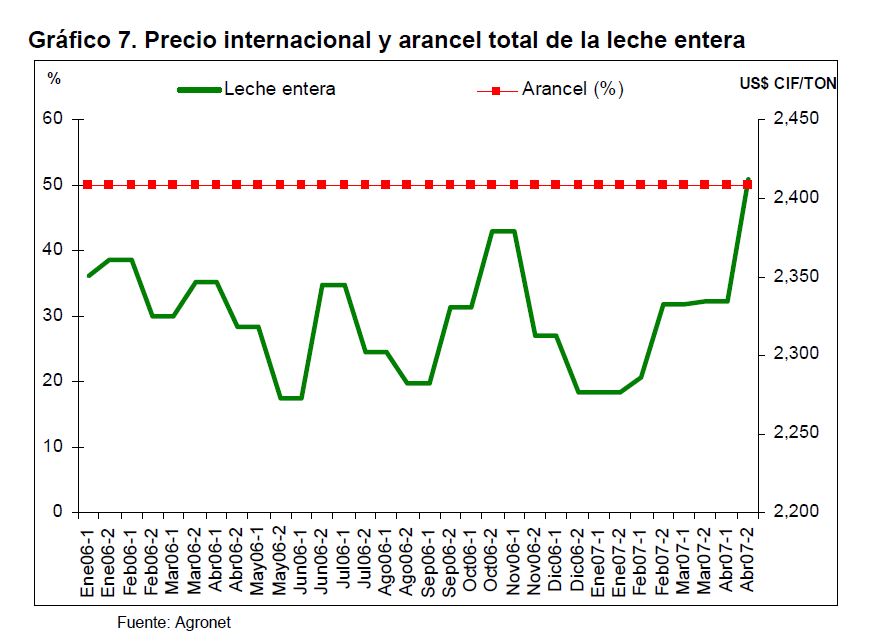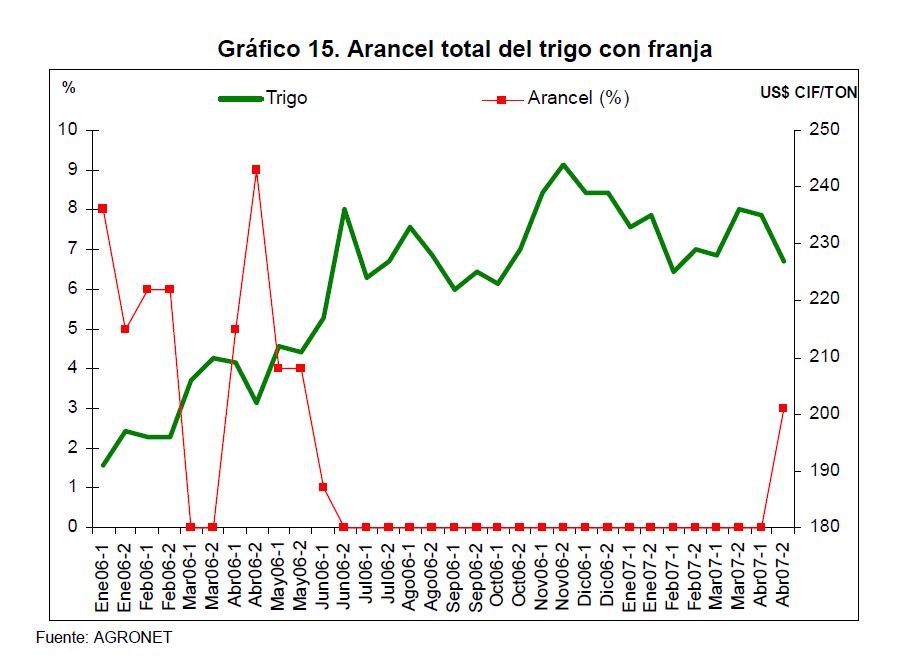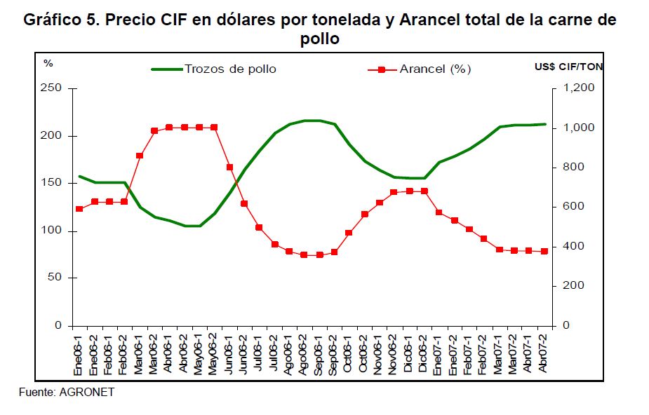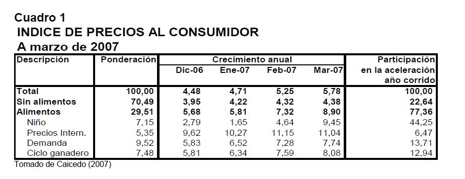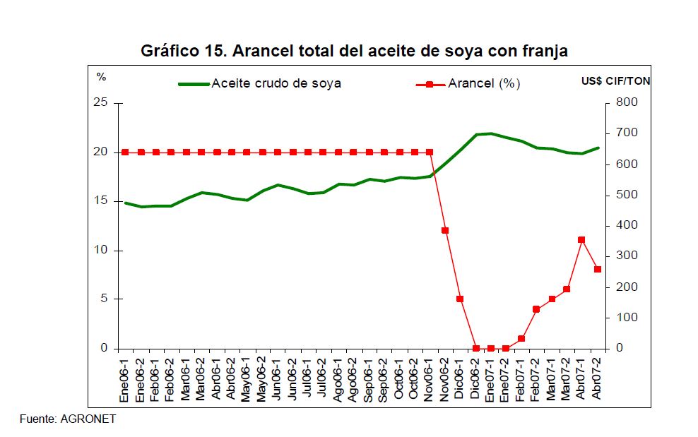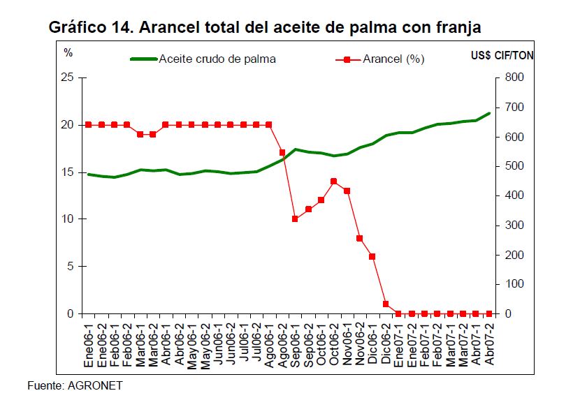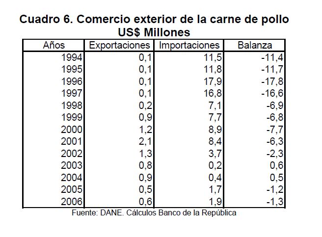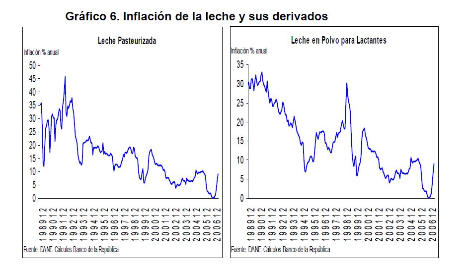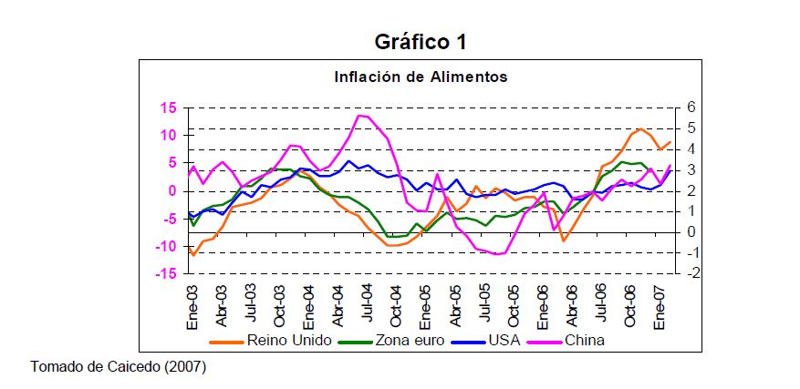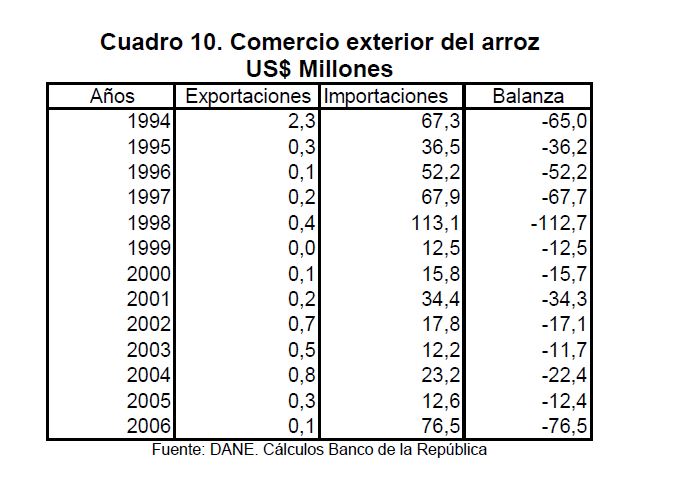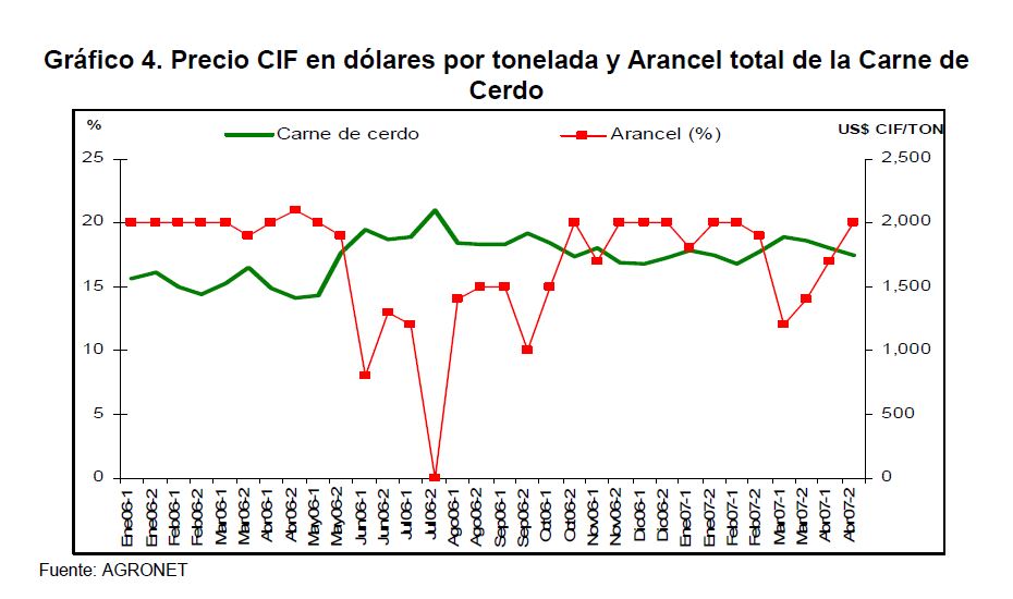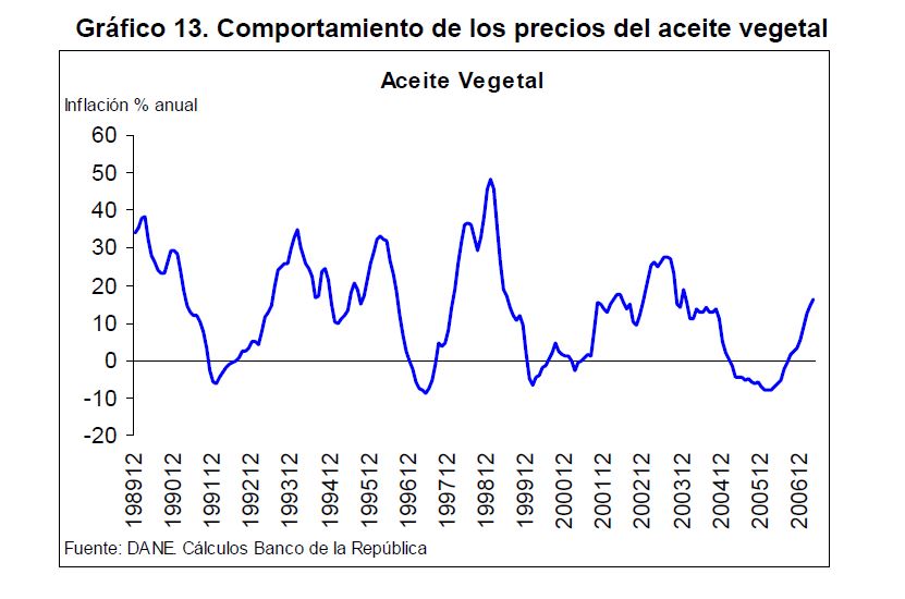 En la actual coyuntura inflacionaria, gran parte del aumento de los precios al consumidor puede atribuirse al comportamiento de los precios de los alimentos, siendo esta la 05r sorpresa en materia de inflación en los primeros meses de 2007. Pueden caracterizarse como factores de oferta y demanda los que han contribuido a acelerar la inflación de los alimentos en la actual coyuntura. Entre los elementos de demanda cabe mencionar: 1) el gran aumento las ventas de alimentos a Venezuela; 2) la aceleración de la demanda interna en Colombia y 3) el crecimiento de los precios internacionales de algunos productos susceptibles de ser transformados en bio-combustibles. Estos factores han coincidido con elementos de oferta como una nueva aparición del Fenómeno de El Niño y el inicio de la fase de retención del ciclo ganadero. La demanda mundial por los productos susceptibles de convertirse en energéticos sin duda ha sido otro elemento que ha presionado a los precios de algunos bienes agrícolas. Esto no ha ocurrido solo en Colombia sino que ha afectado a otros países. En los próximos años este factor tendrá un efecto directo sobre la inflación mundial al consumidor. Este fenómeno de los biocombustibles, junto con el cambio climático y la gran demanda de China e India, amenazan con que la inflación de alimentos se generalice a nivel mundial a niveles sin precedentes y se convierta en un fenómeno más estructural que meramente cíclico. Dentro de las alternativas de solución que se han venido planteando, una de ellas ha sido una revisión de la política comercial en materia de productos agrícolas y agroindustriales en Colombia. Una rebaja de la protección permitiría asegurar un abastecimiento adecuado de estos bienes, o por lo menos en aquellos períodos en que se prevé escasez que pueda llevar a un aumento prolongado de sus precios. Este tipo de política podría contribuir a una morigeración de estas tendencias. Esta revisión podría ser temporal o permanente de acuerdo con lo que se estima dure el choque en cada producto. En este documento se presenta un análisis de las políticas comerciales que cobijan actualmente a algunos de los productos cuyo comportamiento de los precios ha incidido de manera significativa en la inflación de los últimos meses: carne bovina y de pollo, leche, maíz, arroz y sus subproductos, aceites vegetales y trigo y sus subproductos.
