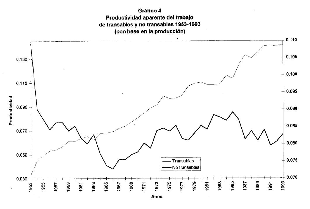 En el gráfico 2 se presenta una definición alternativa de la tasa de cambio real, en este caso la relación entre los precios de los bienes transables y los no transables. En este caso se observa que hay una devaluación inicial, entre 1989 y 1991, seguida de una apreciación que ha sido un fenómeno estructural que ha vivido la economía colombiana durante los últimos 4 años. Dependiendo del índice que se utilice, la apreciación real ha sido de 19% o de 22.6% entre el punto máximo obtenido a comienzos de la década en ambos casos, y el punto mínimo de la serie respectiva. Por supuesto, este fenómeno ha despertado inquietud y preocupación entre los observadores dadas las implicaciones que tiene a nivel de la competitividad de los sectores transables.