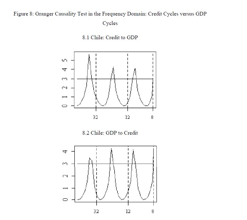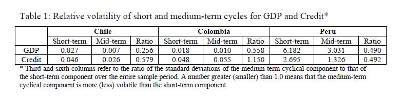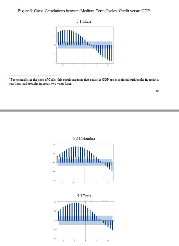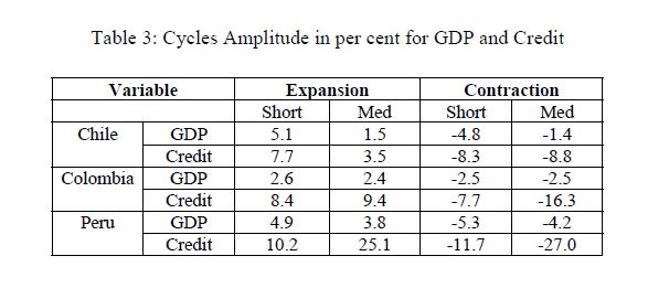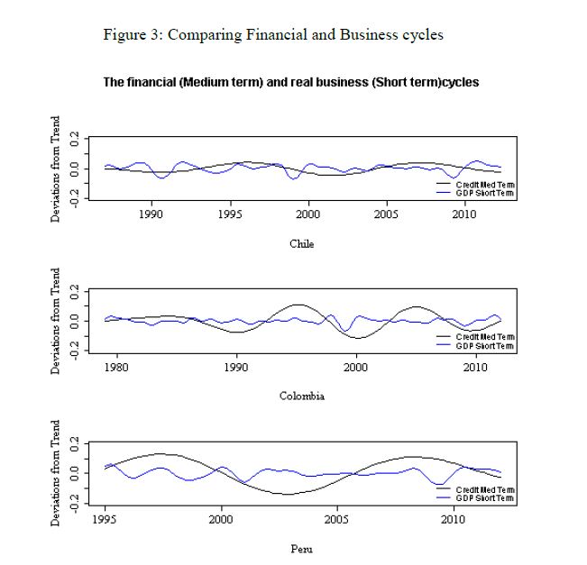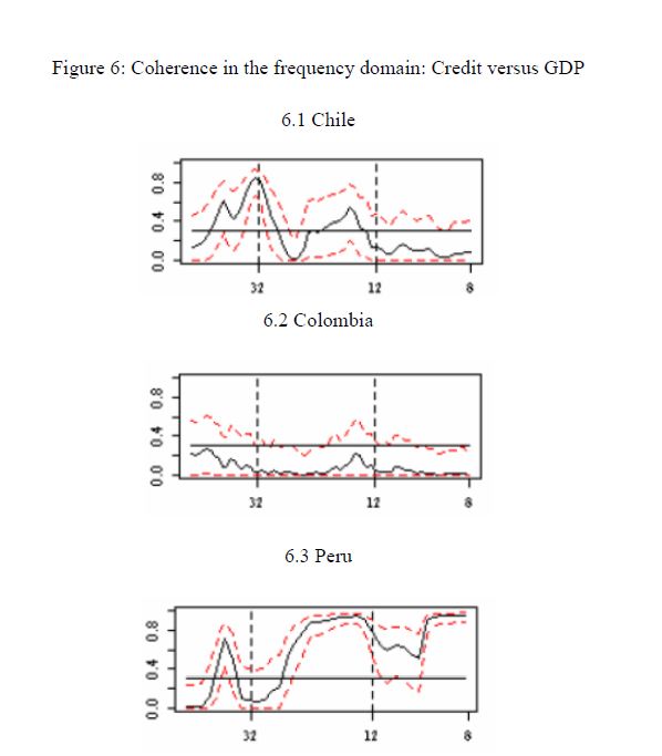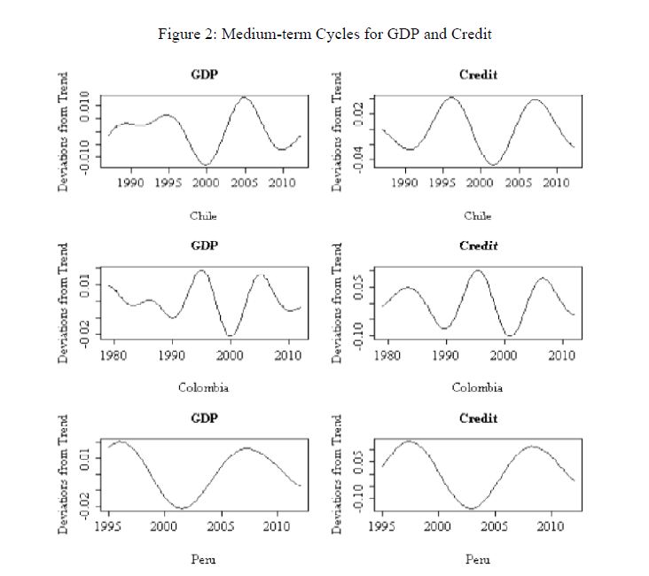 In this document we estimate credit and GDP cycles for three Latin-American economies and study their relation in the time and frequency domains. Cycles are estimated in order to analyze their medium and short-term frequencies. We find that short-term cyc