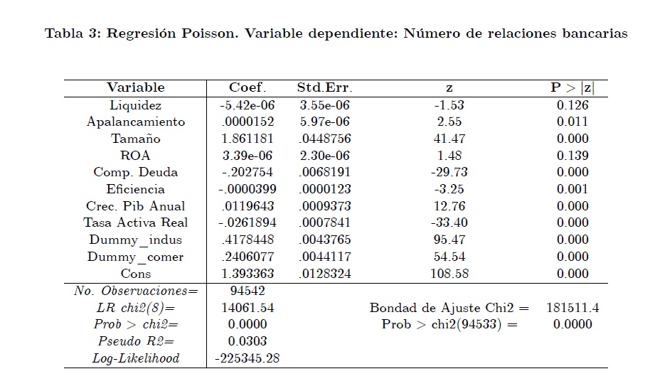 En este documento se realiza una exploración inicial sobre los determinantes del número de relaciones bancarias del sector corporativo privado de Colombia. Siguiendo otros estudios similares que se han realizado para distintos países, se utilizan modelos de datos de cuenta y se estima un modelo de regresión Poisson y un modelo de regresión Binomial Negativo para hallar los determinantes de la variable de interés. Encontramos que los datos presentan sobredispersión, razón por la cual el modelo de regresión Binomial Negativo es más adecuado que el modelo de regresión Poisson en este contexto. Dentro de este ejercicio se encuentra que las variables de liquidez, tamaño de la firma, composición de la deuda, eficiencia, la tasa activa real y la tasa de crecimiento del PIB, resultan ser importantes en la determinación del número de relaciones bancarias. El hecho que las relaciones bancarias sean afectadas por la actividad económica podría sugerir que durante los tiempos de desaceleración económica las empresas buscan fuentes alternativas de financiamiento.