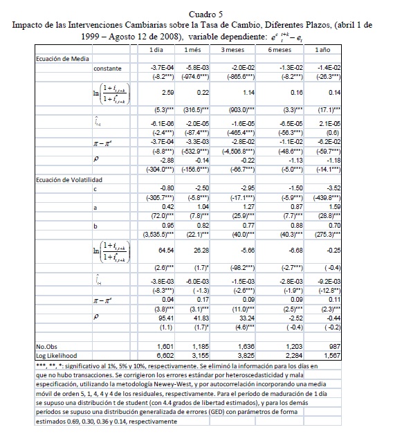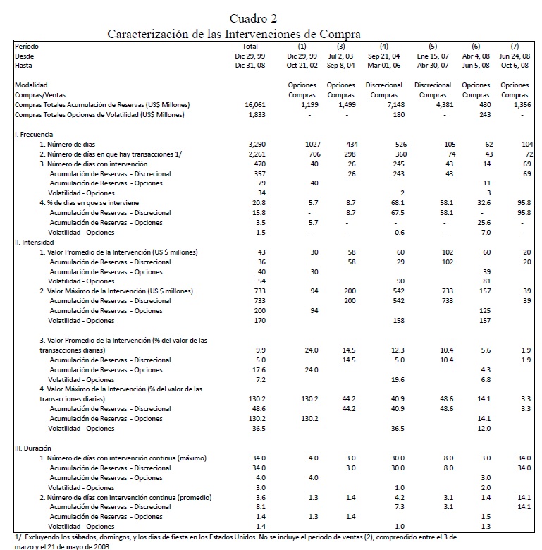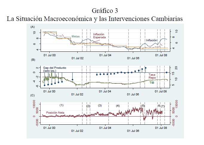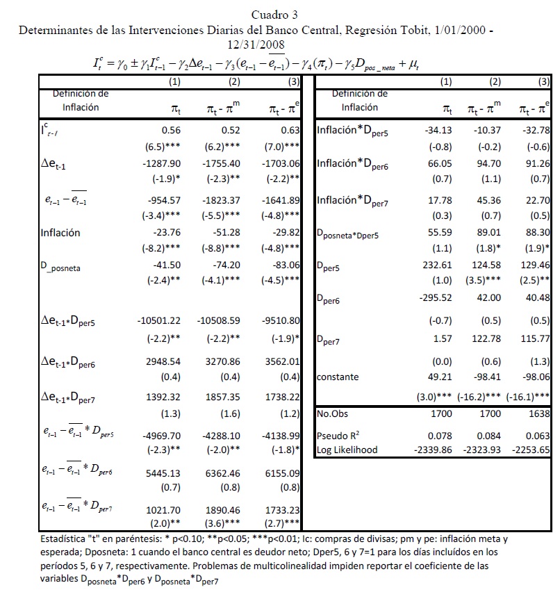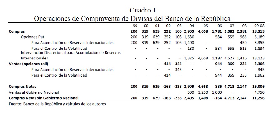 Este trabajo evalúa los determinantes de las compras de divisas y su impacto sobre la tasa de cambio nominal en Colombia durante 2000-2008. Estimaciones Tobit muestran que el Banco Central compró divisas para compensar las reevaluaciones frente al día anterior y para corregir tendencias "excesivas", cuando se redujo la presión inflacionaria y cuando el Banco Central tuvo una posición acreedora neta. La estimación de un modelo E-GARCH muestra que las compras de divisas devaluaron la tasa de cambio y redujeron su volatilidad, tanto en el corto (1 día) como en el mediano plazo (1 mes, 3 meses y 6 meses). Las posibles contradicciones macroeconómicas no fueron suficientemente fuertes como para afectar la función de reacción de las autoridades o el impacto de las intervenciones. El trabajo utiliza metodologías que permiten evaluar la estabilidad de los parámetros de la ecuación de media y de volatilidad para el modelo E-GARCH en forma simultánea.
