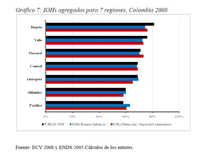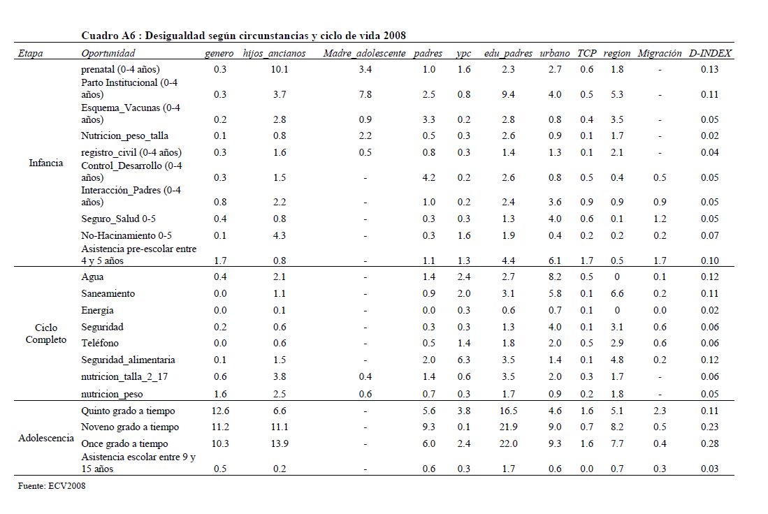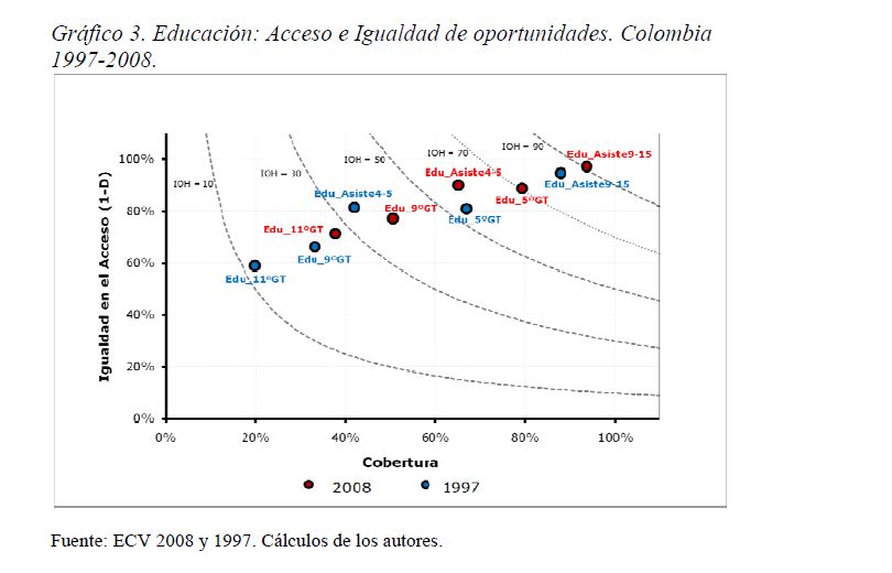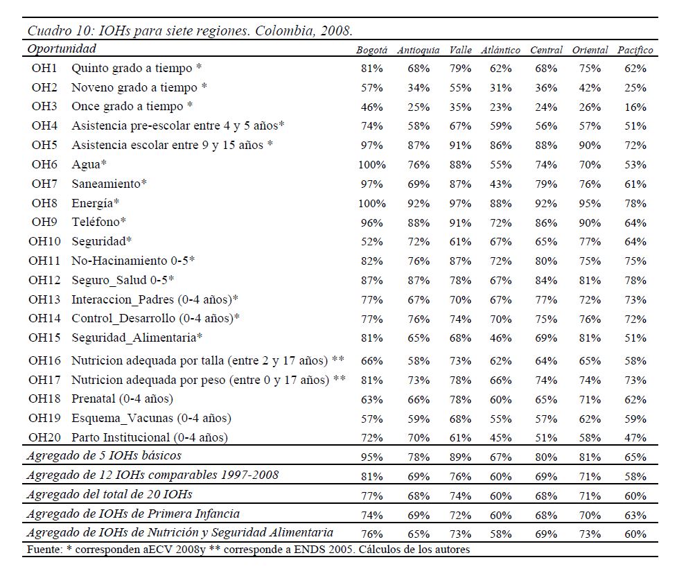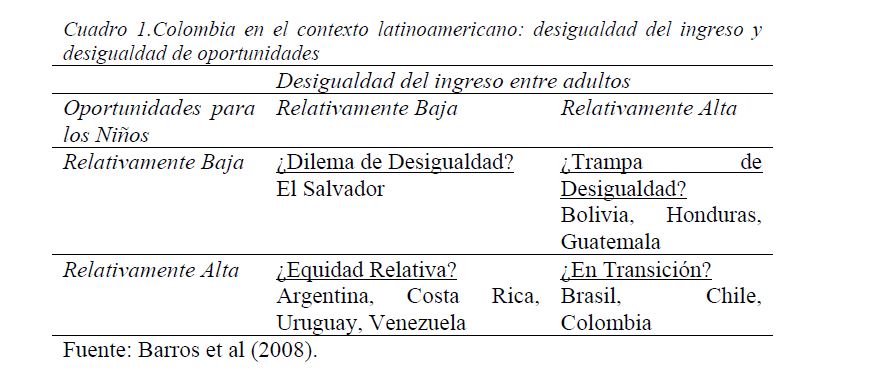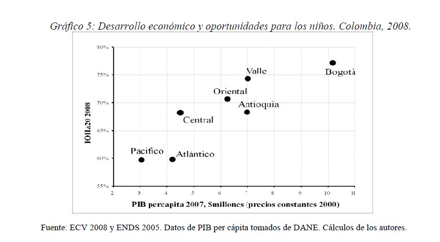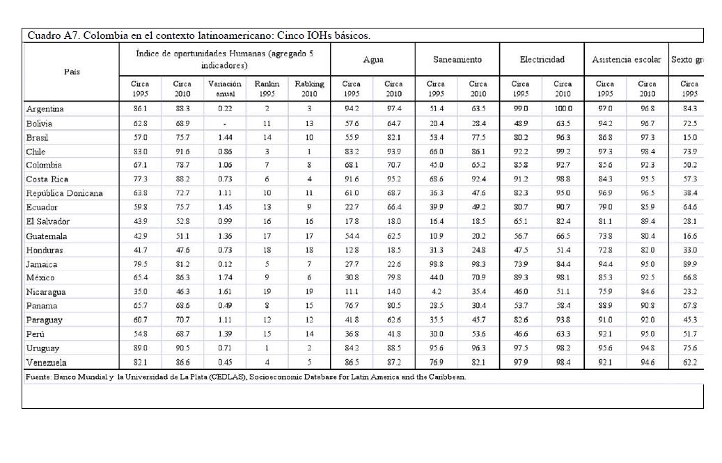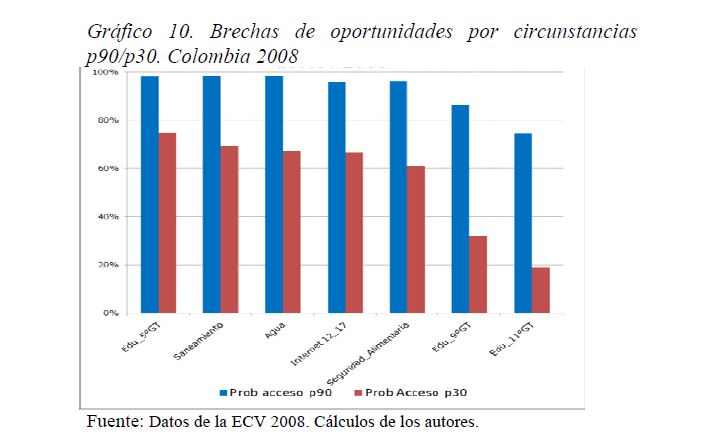 Colombia es un país con alta desigualdad de ingresos y la 05ría de sus ciudadanos considera inequitativa esta situación. De allí la relevancia de medir qué tan lejos está Colombia y sus regiones de un ideal de igualdad de oportunidades entre los niños y los jóvenes. Este documento busca establecer ¿Cuál ha sido el avance nacional y regional de la igualdad de oportunidades en la última década? ¿Cuáles son las circunstancias que están más estrechamente asociadas a la desigualdad de oportunidades de los niños colombianos? ¿En cuáles sectores se está ofreciendo 05r acceso a bienes y servicios básicos de vivienda, de educación, de salud y TICs, y a niveles adecuados de nutrición, independientemente de las circunstancias menos favorables del hogar y del lugar que ellos habitan? Durante la última década Colombia logró importantes avances en varios Índices de Oportunidades Humanas, pero aún subsisten considerables brechas de oportunidades entre niños en circunstancias favorables y desfavorables. Las siete 05res brechas de oportunidades se dan en la culminacion de educación primaria, media y secundaria a tiempo, en la Seguridad Alimentaria, en el acceso a Agua y Saneamiento, y en el acceso a Internet. En la comparación de regiones sobresalen los avances de la región Oriental (compuesta por los departamentos de Boyacá, Cundinamarca, Meta y Santanderes) y preocupa el atraso de las regiones Atlantica y Pacífica (particularmente en seguridad alimentaria). Cuatro circunstancias juegan un papel preponderante en la desigualdad de oportunidades: (i) educación de los padres, (ii) localización urbano-rural (AMs y Capitales de departamento, centros urbanos medianos y pequeños, y rural), (iii) la localización por Regiones, y, (iv) la presencia de hijos, ancianos y discapacitados en el hogar.