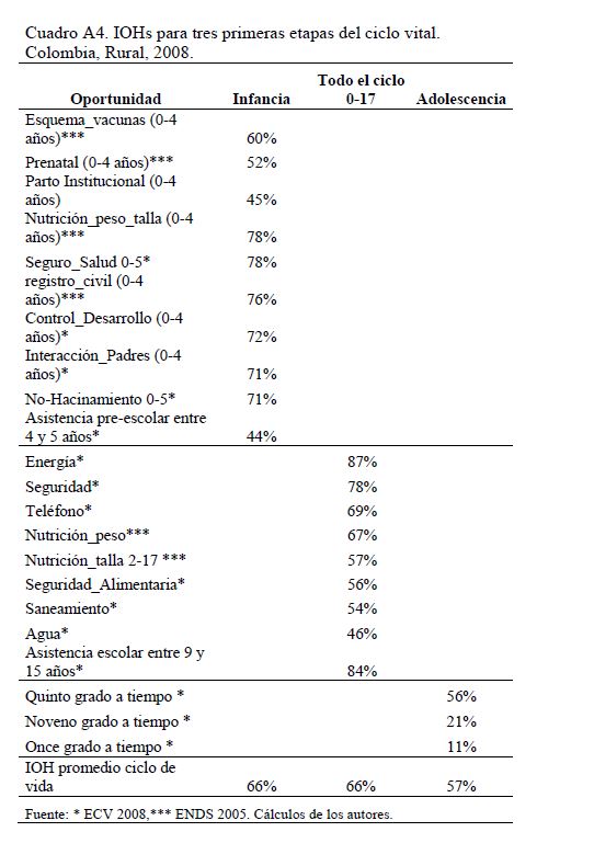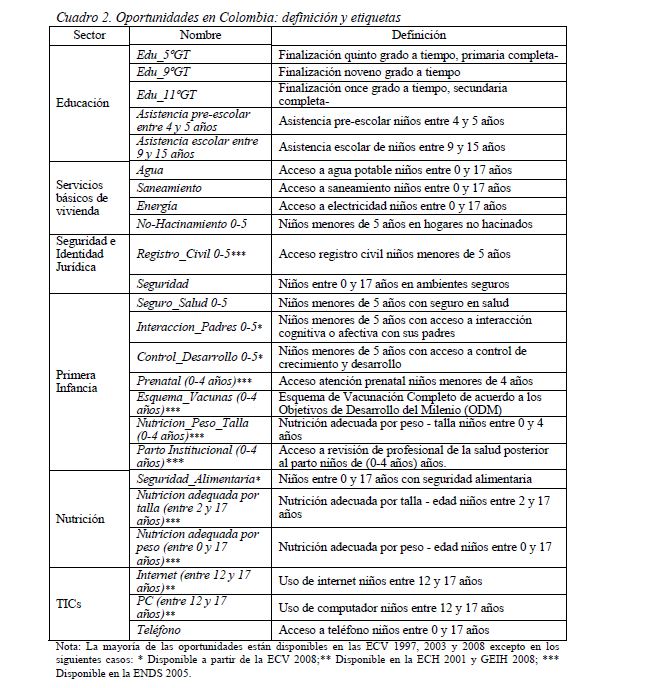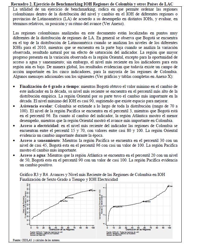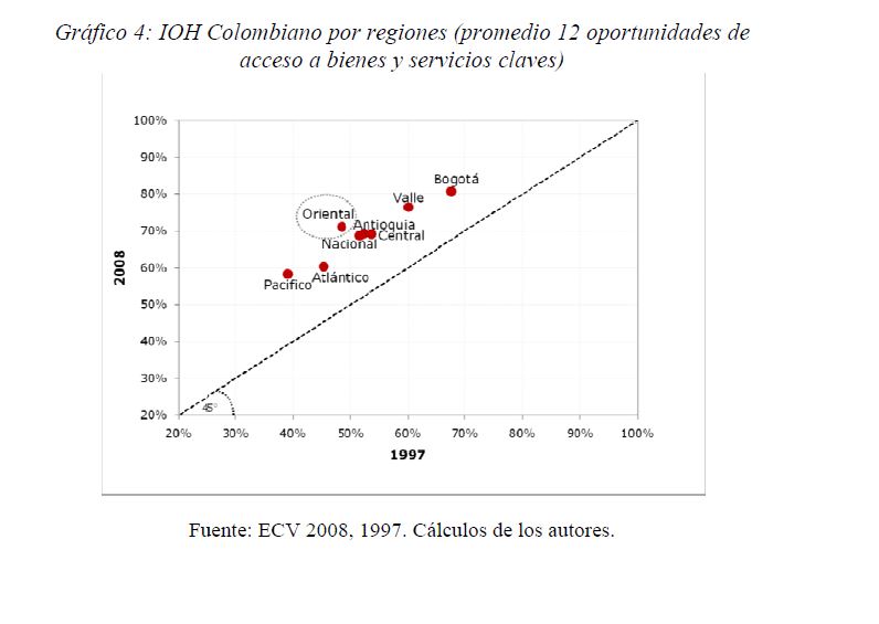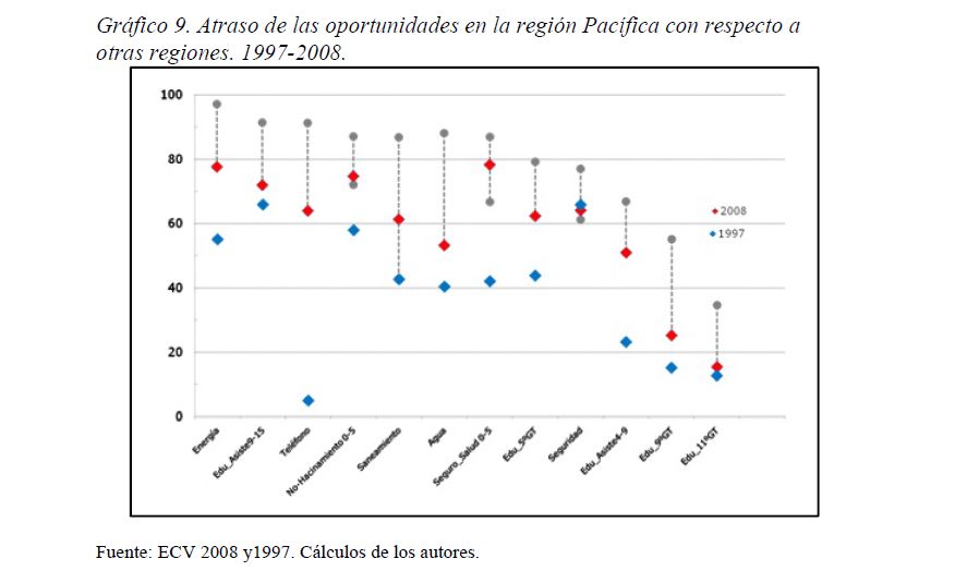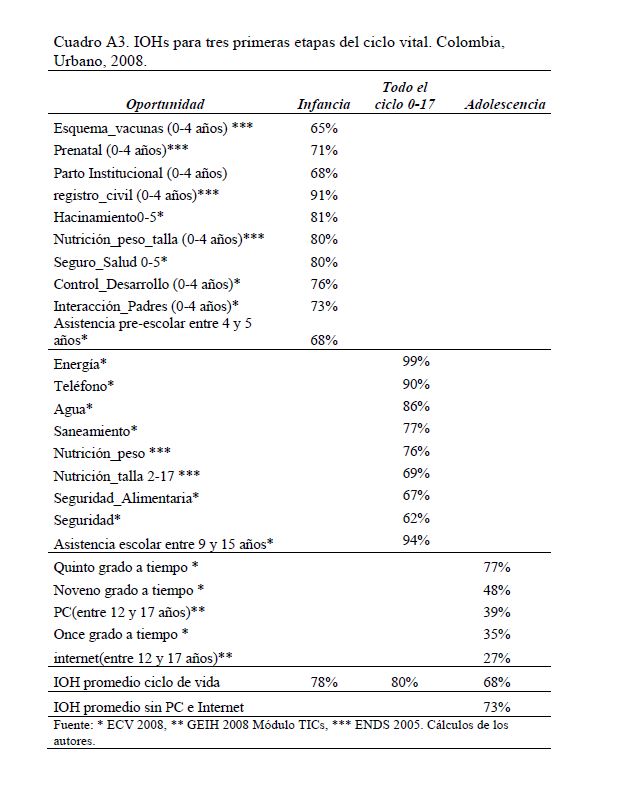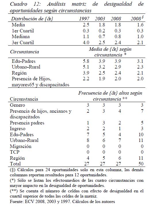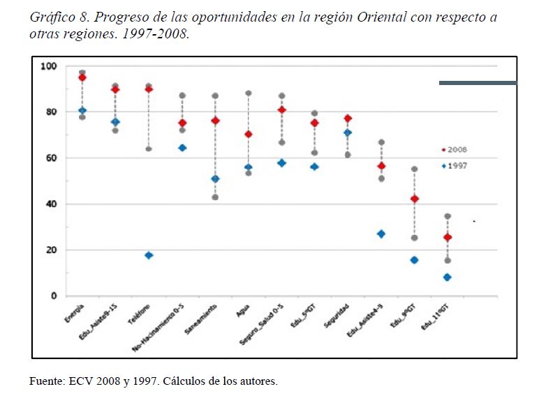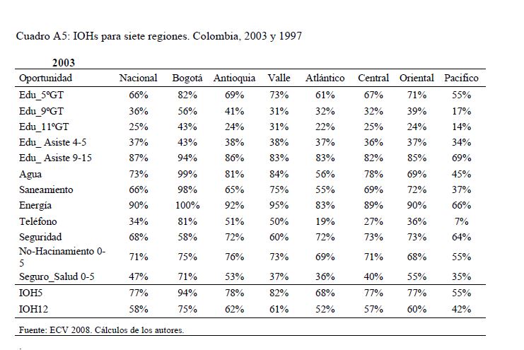 Colombia es un país con alta desigualdad de ingresos y la 05ría de sus ciudadanos considera inequitativa esta situación. De allí la relevancia de medir qué tan lejos está Colombia y sus regiones de un ideal de igualdad de oportunidades entre los niños y los jóvenes. Este documento busca establecer ¿Cuál ha sido el avance nacional y regional de la igualdad de oportunidades en la última década? ¿Cuáles son las circunstancias que están más estrechamente asociadas a la desigualdad de oportunidades de los niños colombianos? ¿En cuáles sectores se está ofreciendo 05r acceso a bienes y servicios básicos de vivienda, de educación, de salud y TICs, y a niveles adecuados de nutrición, independientemente de las circunstancias menos favorables del hogar y del lugar que ellos habitan? Durante la última década Colombia logró importantes avances en varios Índices de Oportunidades Humanas, pero aún subsisten considerables brechas de oportunidades entre niños en circunstancias favorables y desfavorables. Las siete 05res brechas de oportunidades se dan en la culminacion de educación primaria, media y secundaria a tiempo, en la Seguridad Alimentaria, en el acceso a Agua y Saneamiento, y en el acceso a Internet. En la comparación de regiones sobresalen los avances de la región Oriental (compuesta por los departamentos de Boyacá, Cundinamarca, Meta y Santanderes) y preocupa el atraso de las regiones Atlantica y Pacífica (particularmente en seguridad alimentaria). Cuatro circunstancias juegan un papel preponderante en la desigualdad de oportunidades: (i) educación de los padres, (ii) localización urbano-rural (AMs y Capitales de departamento, centros urbanos medianos y pequeños, y rural), (iii) la localización por Regiones, y, (iv) la presencia de hijos, ancianos y discapacitados en el hogar.