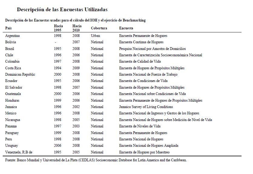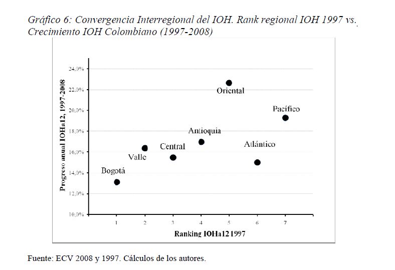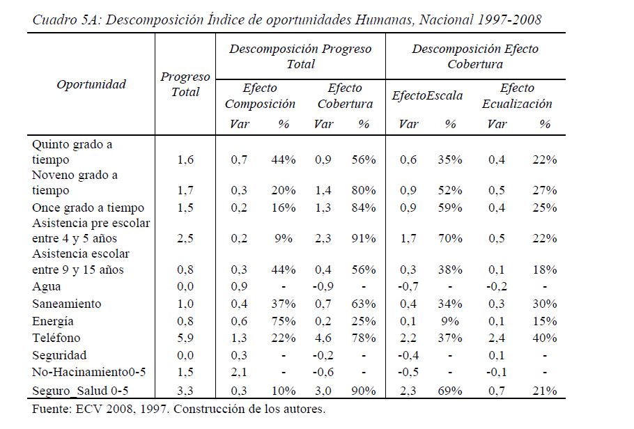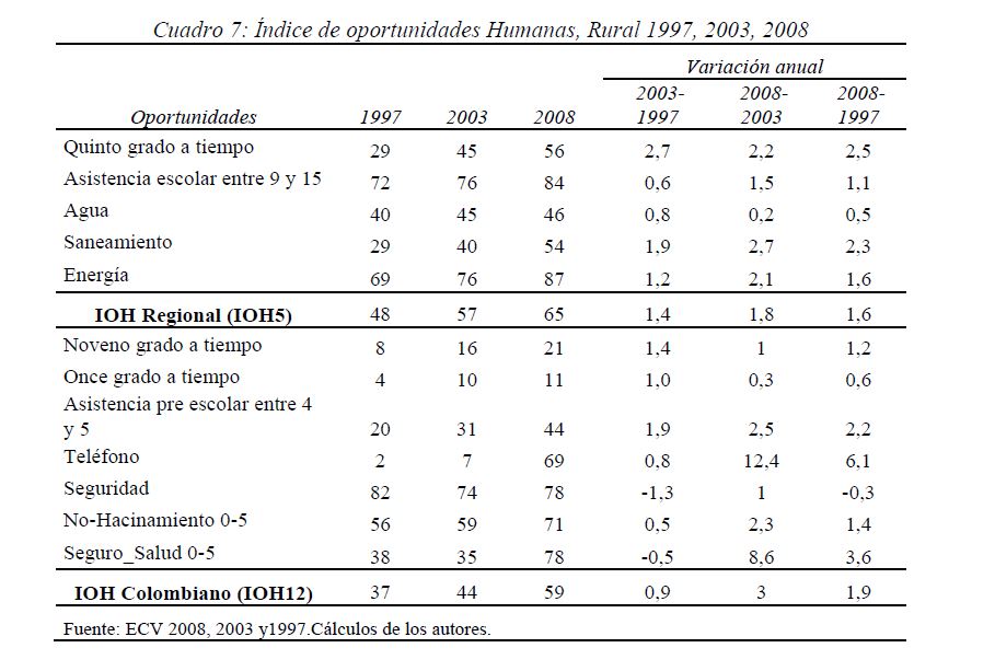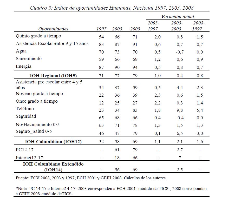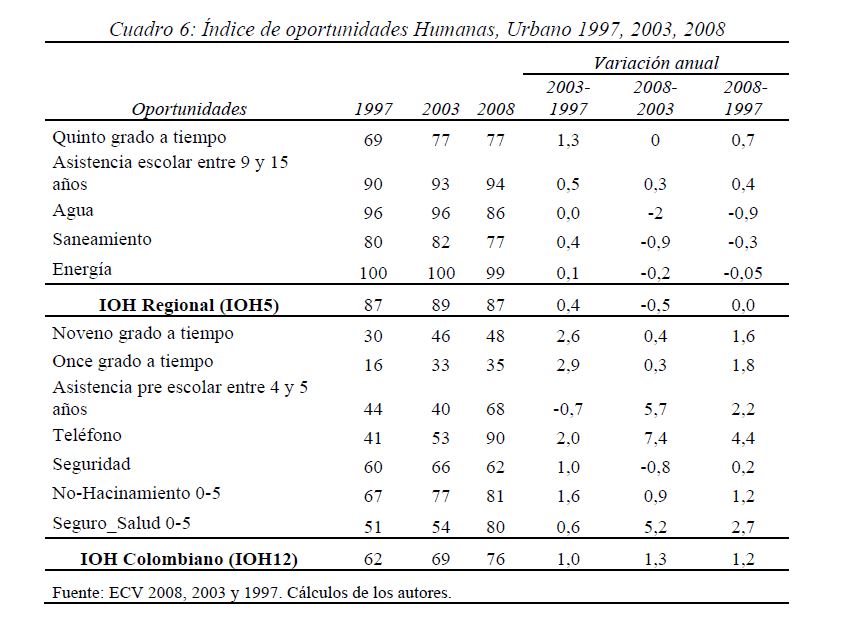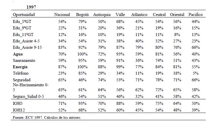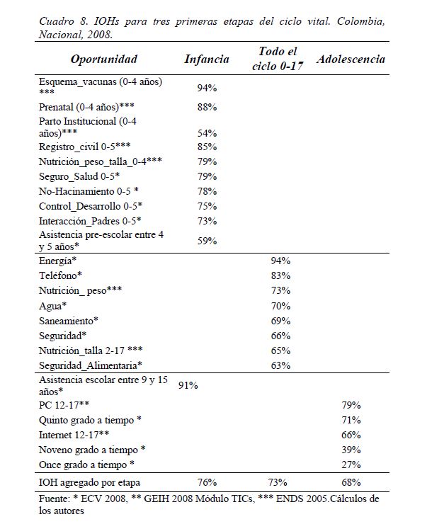 Colombia es un país con alta desigualdad de ingresos y la 05ría de sus ciudadanos considera inequitativa esta situación. De allí la relevancia de medir qué tan lejos está Colombia y sus regiones de un ideal de igualdad de oportunidades entre los niños y los jóvenes. Este documento busca establecer ¿Cuál ha sido el avance nacional y regional de la igualdad de oportunidades en la última década? ¿Cuáles son las circunstancias que están más estrechamente asociadas a la desigualdad de oportunidades de los niños colombianos? ¿En cuáles sectores se está ofreciendo 05r acceso a bienes y servicios básicos de vivienda, de educación, de salud y TICs, y a niveles adecuados de nutrición, independientemente de las circunstancias menos favorables del hogar y del lugar que ellos habitan? Durante la última década Colombia logró importantes avances en varios Índices de Oportunidades Humanas, pero aún subsisten considerables brechas de oportunidades entre niños en circunstancias favorables y desfavorables. Las siete 05res brechas de oportunidades se dan en la culminacion de educación primaria, media y secundaria a tiempo, en la Seguridad Alimentaria, en el acceso a Agua y Saneamiento, y en el acceso a Internet. En la comparación de regiones sobresalen los avances de la región Oriental (compuesta por los departamentos de Boyacá, Cundinamarca, Meta y Santanderes) y preocupa el atraso de las regiones Atlantica y Pacífica (particularmente en seguridad alimentaria). Cuatro circunstancias juegan un papel preponderante en la desigualdad de oportunidades: (i) educación de los padres, (ii) localización urbano-rural (AMs y Capitales de departamento, centros urbanos medianos y pequeños, y rural), (iii) la localización por Regiones, y, (iv) la presencia de hijos, ancianos y discapacitados en el hogar.