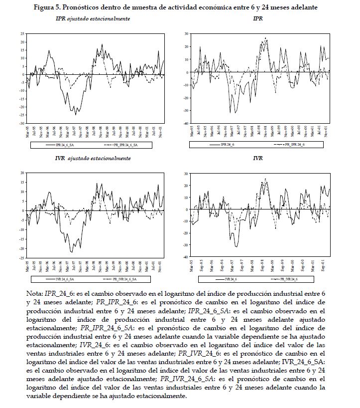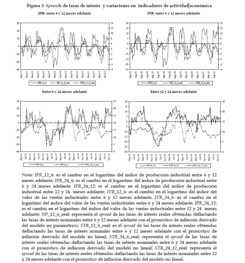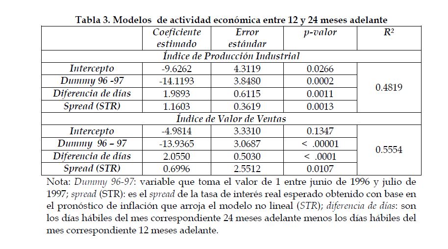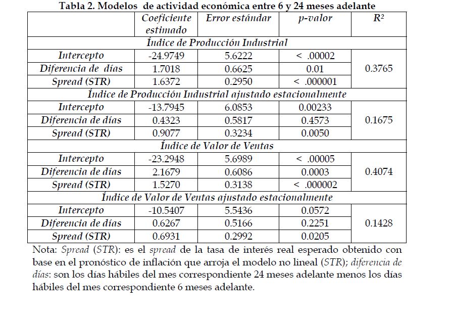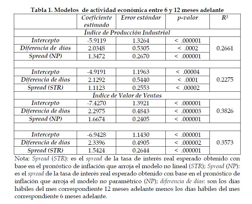 Se presenta evidencia clara a favor de la hipótesis de que la estructura a plazo real contiene información sobre las expectativas de la actividad económica en Colombia para los plazos entre 6 y 12, 6 y 24, y 12 y 24 meses adelante. Los signos de los coeficientes estimados son, en todos los casos, los que predice la teoría. La capacidad de pronóstico del modelo es mejor para el período entre 6 y 12 meses adelante que para periodos superiores.