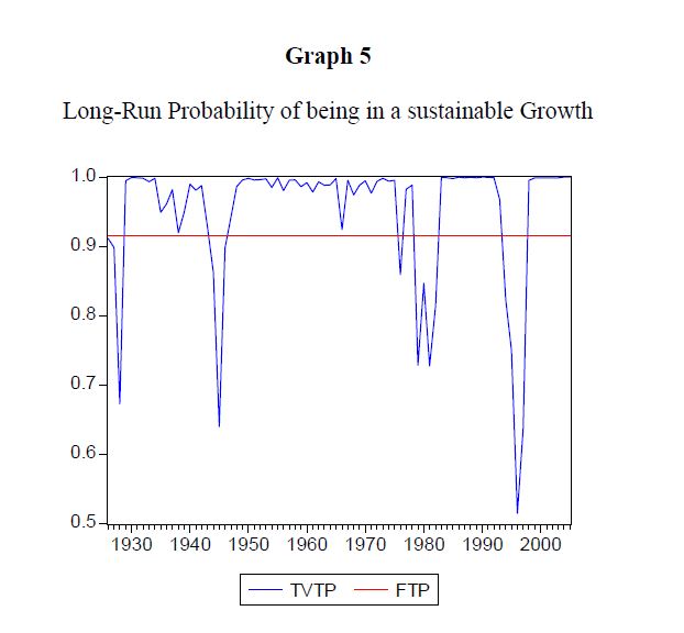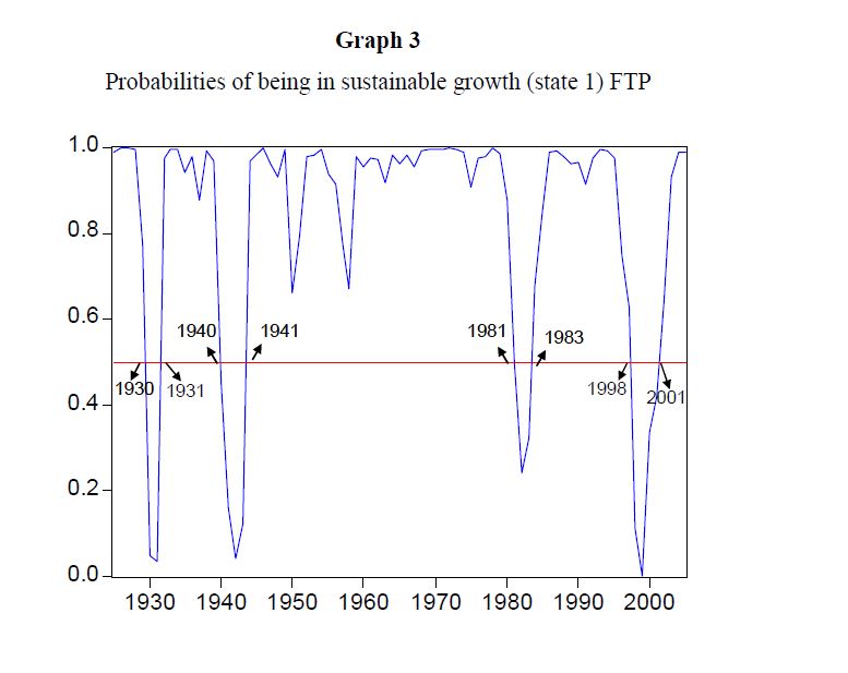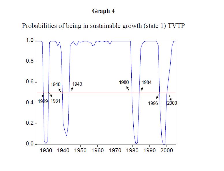 We modelled the Colombian long run per capita economic growth (1925-2005) using a Markov switching regime model with both fixed (FTP) and time-varying transition probabilities (TVTP) to explain regime changes in the economic growth. We found evidence of n