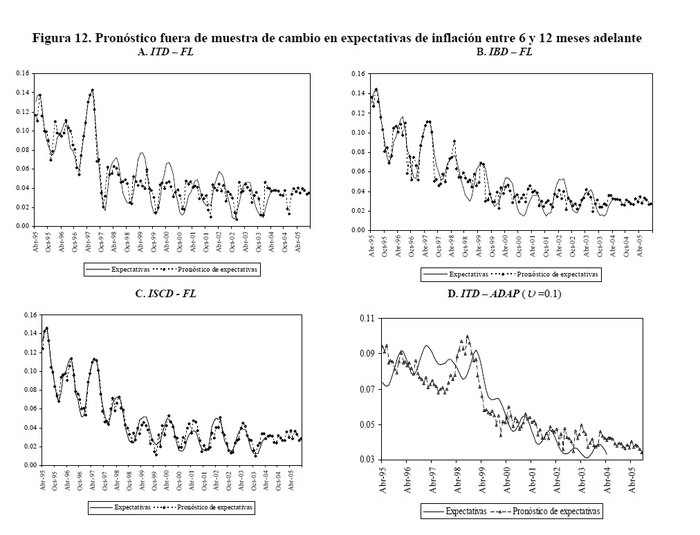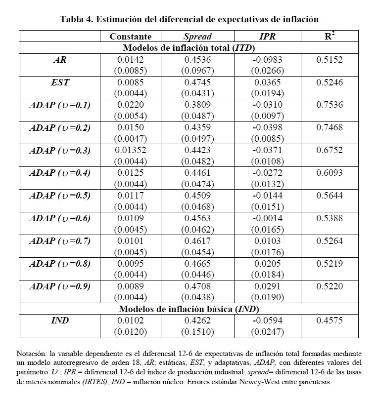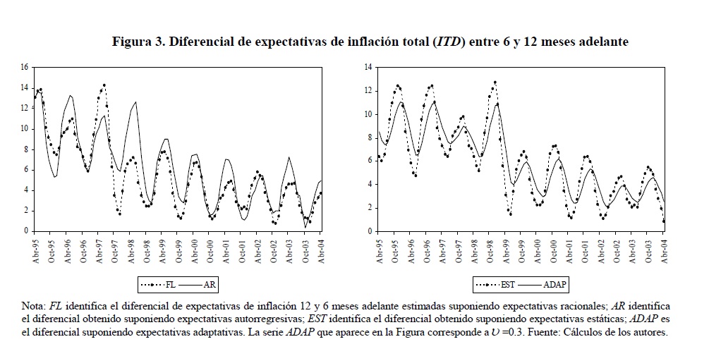 La consideración de la prima de riesgo de inflación en la ecuación de Fisher y los cambios de Régimen inflacionario en Colombia durante los últimos años nos permiten examinar la hipótesis de linealidad para los diferenciales esperados de inflación entre 6 y 12 meses adelante construidos suponiendo cuatro mecanismos de formación de expectativas sobre la inflación total futura: expectativas racionales, autorregresivas, estáticas y adaptativas. El primero de ellos se utiliza también para tres definiciones de inflación básica corrientemente empleadas por el Banco de la República. Se emplean dos conjuntos de información para examinar la hipótesis de la existencia del efecto Fisher: el IRTES y la curva cero cupón. Solamente para la inflación total y dos definiciones de inflación básica se pudo rechazar la hipótesis de linealidad. Siempre que se usa la IRTES los resultados son los que predice la teoría en signo y significancia. El contenido informativo del spread de tasas de interés es sensible al conjunto de información utilizado para construir y al mecanismo de expectativas empleado.