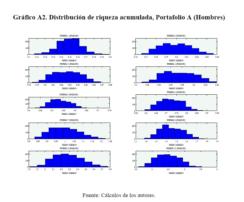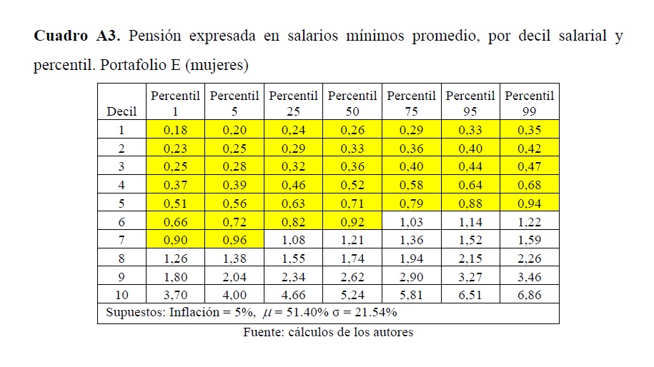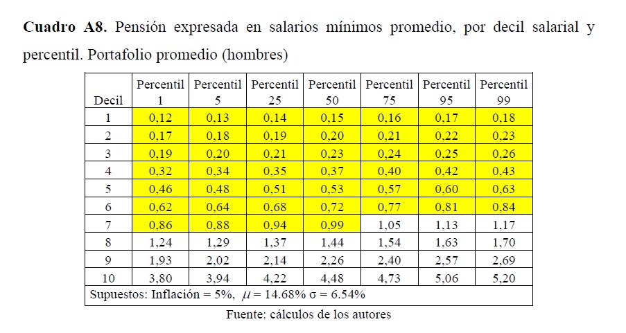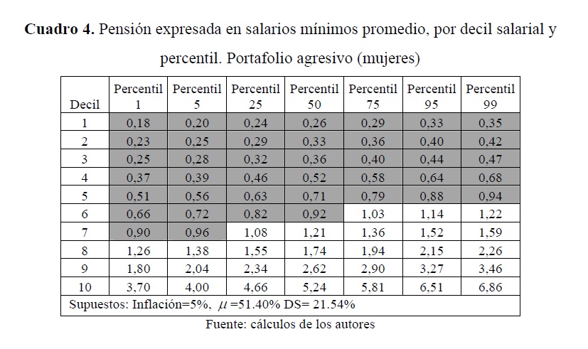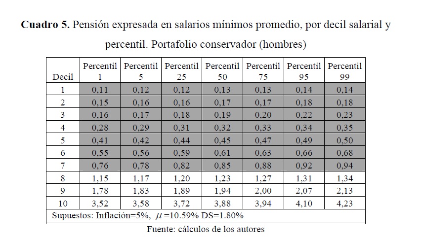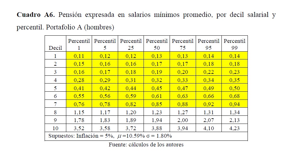 Este trabajo desarrolla un modelo de simulación para estimar el flujo de caja de un pensionado que tiene su cuenta individual en una administradora de fondos de pensiones (AFP) colombiana. Aquel se proyecta a partir de las sendas salariales y densidades de cotización estimadas por la Dirección de Estudios Económicos del Departamento Nacional de Planeación (DNP) y, con base en lo anterior, se calcula el valor de la pensión que se podría obtener a partir de la riqueza acumulada al final de la vida laboral. Los resultados muestran que, de no adoptar medidas encaminadas a aumentar las densidades y las tasas de cotización, un gran porcentaje de la fuerza laboral obtendría pensiones inferiores a la mínima establecida por ley, pero no cumpliría con los requisitos para acceder a la garantía estatal para obtener la misma.