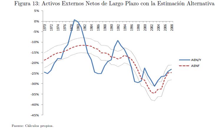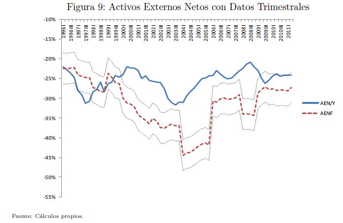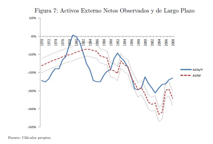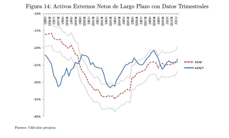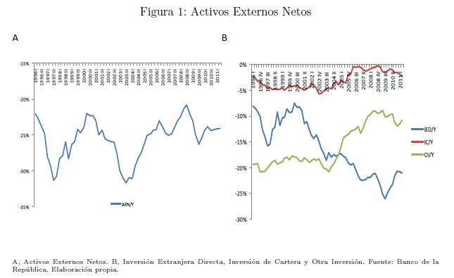 En este trabajo se calcula un nivel de equilibrio para los Activos Externos Netos de Colombia (AEN), y se estudian sus implicaciones sobre el Tipo de Cambio Real (TCR). Para determinar el nivel de equilibrio de AEN, se estima un vector de cointegración con un panel de efectos fijos ajustado por medio de Mínimos Cuadrados Dinámicos. A partir del nivel de largo plazo estimado de AEN, se analizan las implicaciones sobre el TCR a través de la metodología de Sostenibilidad Externa, la cual permite derivar niveles ideales de la Cuenta Corriente y del TCR. Los principales resultados indican que durante los últimos años, el nivel de AEN se ha ubicado cerca a sus niveles de largo plazo. Además, se detectan los períodos en los cuales el TCR ha estado relativamente alejado de sus niveles ideales.