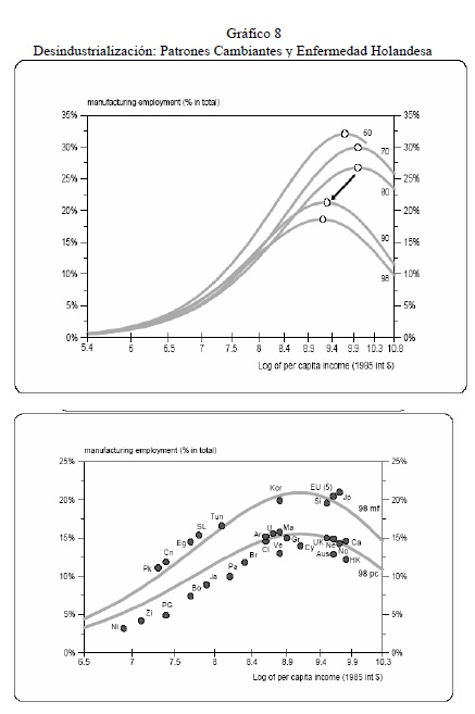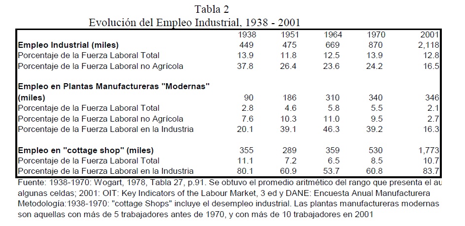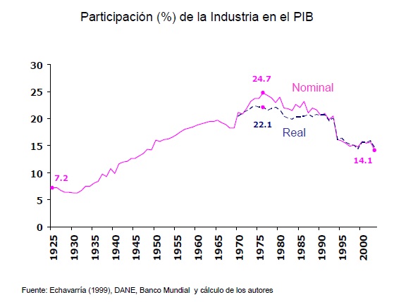 El Proceso Colombiano de Desindustrialización El proceso Colombiano de Desindustrialización*Juan José EchavarríaMauricio Villamizar (Con la colaboración de Juanita González) Resumen El proceso colombiano de industrialización tuvo corta duración. El despegue comenzó en la década de los años 1930s, cuarenta años más tarde que en Argentina, Brasil, Chile o México, y la industria (especialmente la moderna) perdió dinamismo desde los 1960s (empleo) y 1970s (producción). Se trata de dinámicas mundiales parcialmente relacionadas con la productividad relativa del sector y con el impacto de la política económica. La política económica jugó un papel central en la dinámica de la industria. El bajo desarrollo del sector financiero ha restringido el crecimiento del sector, obligando a las firmas a depender exageradamente de utilidades reinvertidas costosas, aún cuando la liberalización financiera de los 1990s tuvo un impacto positivo en materia de productividad. Algo similar sucedió con la apertura arancelaria y para-arancelaria adoptada en ese mismo período. La evidencia empírica confirma que hoy se cuenta con un sector industrial moderno mucho más competitivo, preparado para afrontar el reto de la globalización.