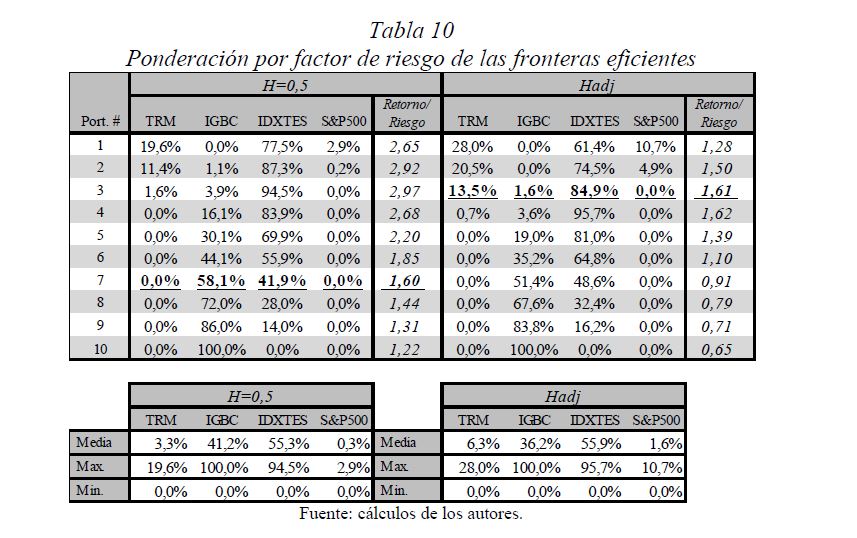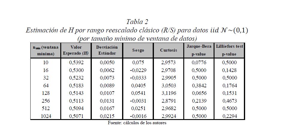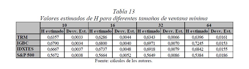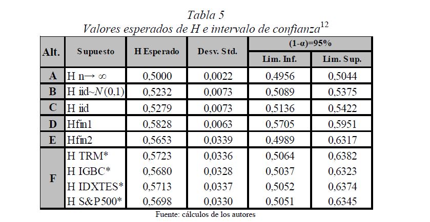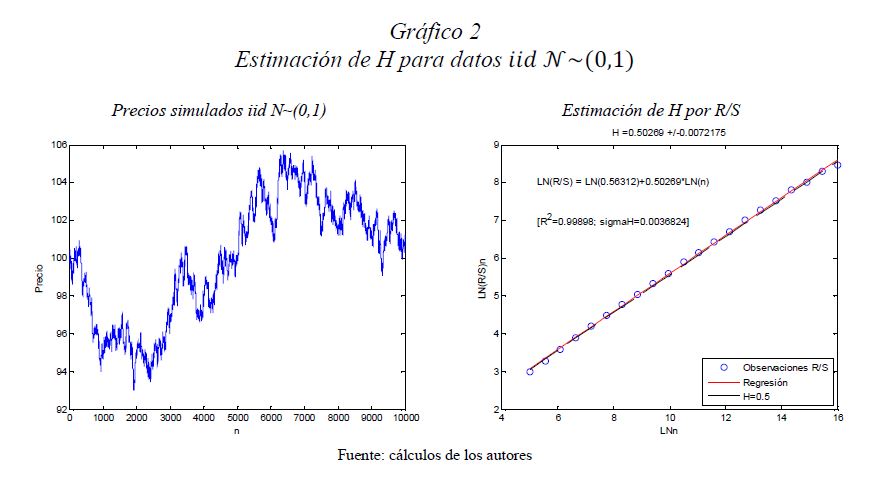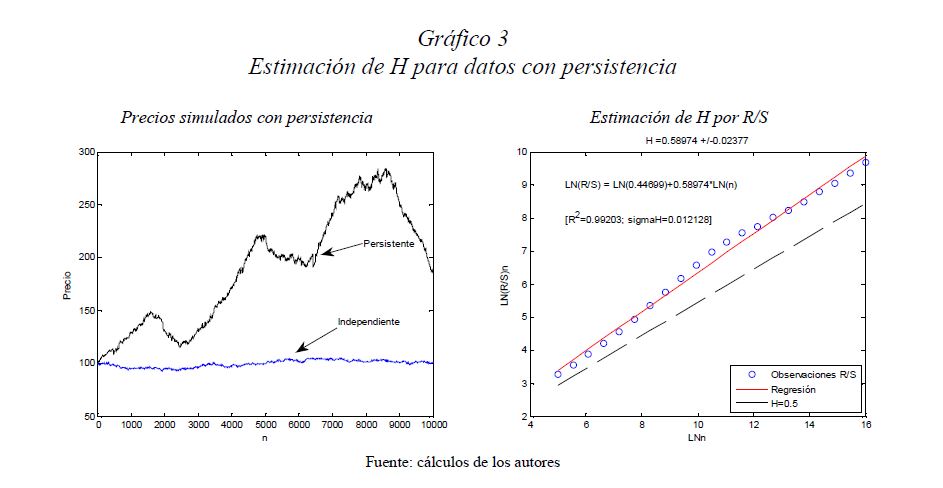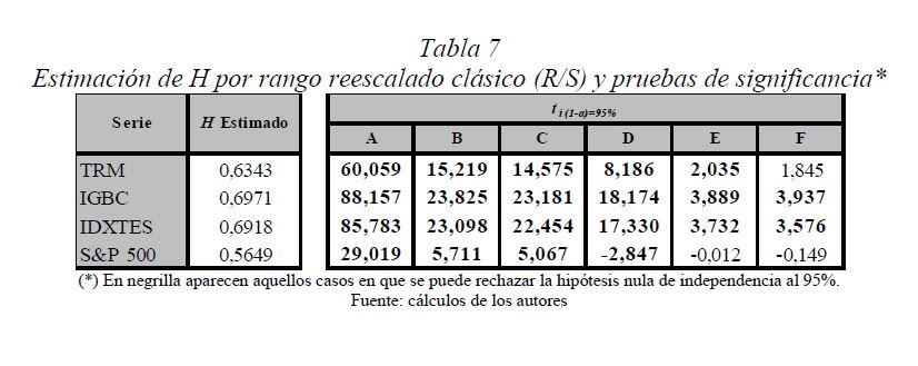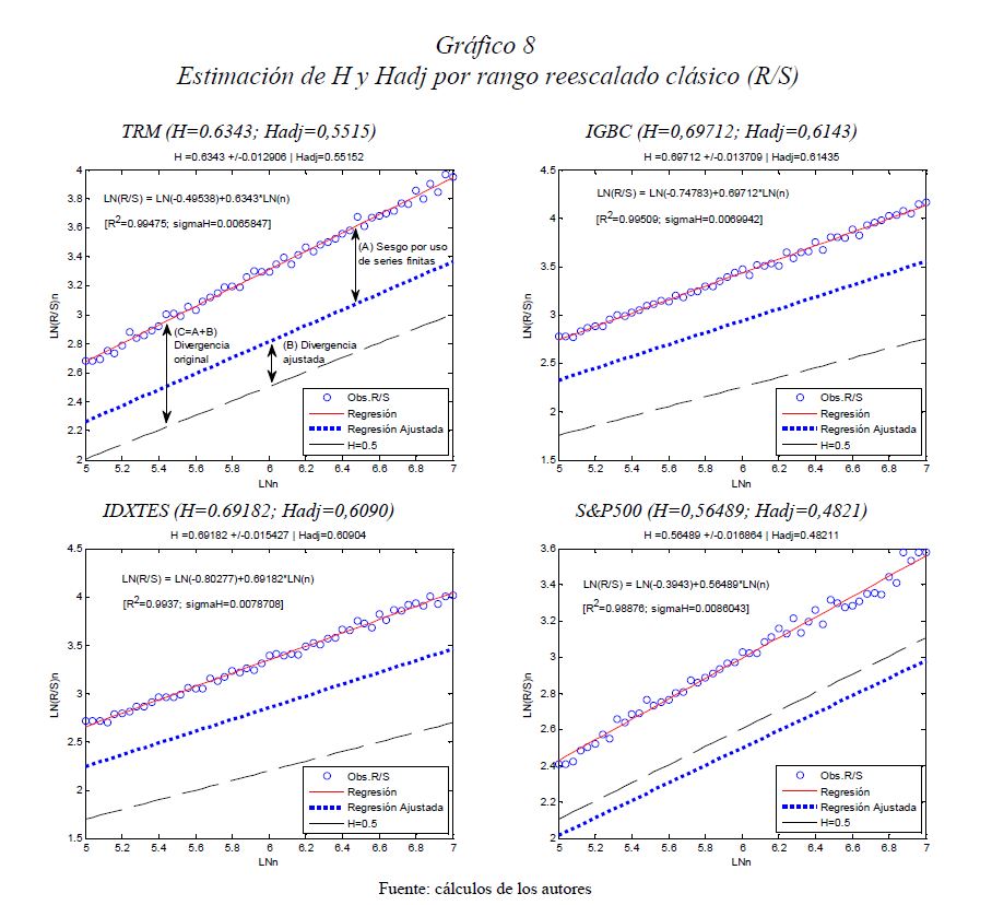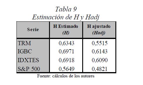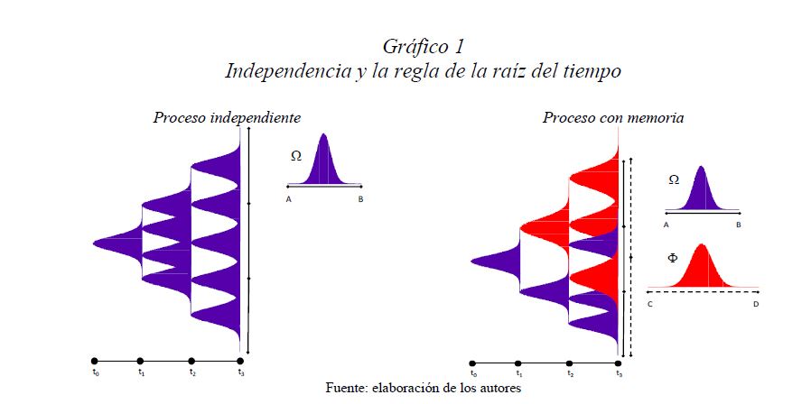 Es una práctica muy difundida el multiplicar la desviación estándar por la raíz del tiempo para escalarla a otros plazos. Así, con base en la estimación de la desviación estándar o del VaR (Value at Risk) diario, es usual obtener la desviación estándar o el VaR para un periodo de diez días como el producto de la primera y la raíz de diez. Esta práctica, basada en la hipótesis de los mercados eficientes, supone que los cambios de los precios son independientes entre sí; es decir, que las series de tiempo no presentan memoria. El presente documento se ocupa de estimar la presencia de memoria de largo plazo en los mercados cambiario, accionario y de renta fija colombianos, para lo cual se utiliza la metodología de rango reescalado clásico (R/S) y modificado (mR/S).Además de encontrar persistencia significativa para el mercado accionario y de renta fija, se estima el exponente de Hurst ajustado, el cual sirve para cuantificar el error derivado de algunas prácticas basadas en el supuesto de independencia. De acuerdo con los resultados obtenidos para dichos mercados, (i) el supuesto según el cual los precios reflejan toda la información disponible es errado; (ii) algunas prácticas en la optimización de portafolios y la valoración de activos son cuestionables, y (iii) tal como se infiere de la revisión hecha en 2009 por el Comité de Basilea a los estándares cuantitativos para el cálculo del riesgo de mercado, la regla de la raíz del tiempo subestima significativamente el riesgo.