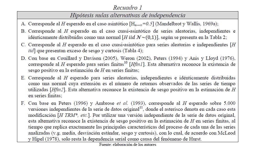 | dc.description | Es una práctica muy difundida el multiplicar la desviación estándar por la raíz del tiempo para escalarla a otros plazos. Así, con base en la estimación de la desviación estándar o del VaR (Value at Risk) diario, es usual obtener la desviación estándar o el VaR para un periodo de diez días como el producto de la primera y la raíz de diez. Esta práctica, basada en la hipótesis de los mercados eficientes, supone que los cambios de los precios son independientes entre sí; es decir, que las series de tiempo no presentan memoria. El presente documento se ocupa de estimar la presencia de memoria de largo plazo en los mercados cambiario, accionario y de renta fija colombianos, para lo cual se utiliza la metodología de rango reescalado clásico (R/S) y modificado (mR/S).Además de encontrar persistencia significativa para el mercado accionario y de renta fija, se estima el exponente de Hurst ajustado, el cual sirve para cuantificar el error derivado de algunas prácticas basadas en el supuesto de independencia. De acuerdo con los resultados obtenidos para dichos mercados, (i) el supuesto según el cual los precios reflejan toda la información disponible es errado; (ii) algunas prácticas en la optimización de portafolios y la valoración de activos son cuestionables, y (iii) tal como se infiere de la revisión hecha en 2009 por el Comité de Basilea a los estándares cuantitativos para el cálculo del riesgo de mercado, la regla de la raíz del tiempo subestima significativamente el riesgo. | spa |