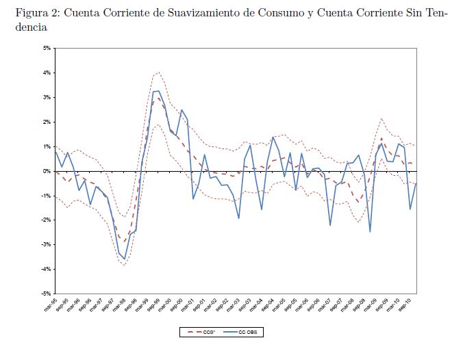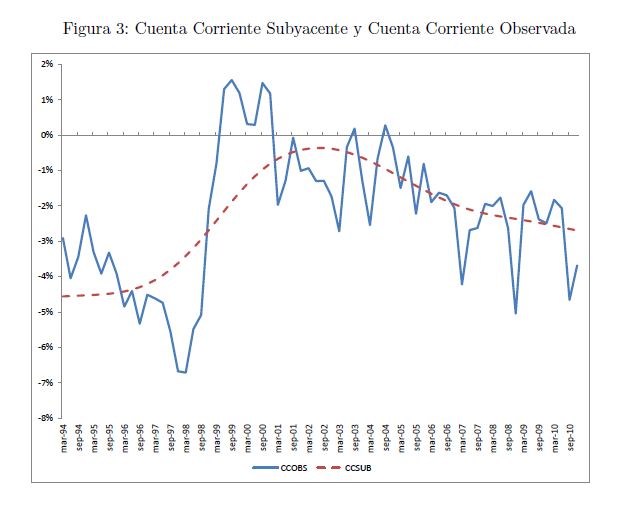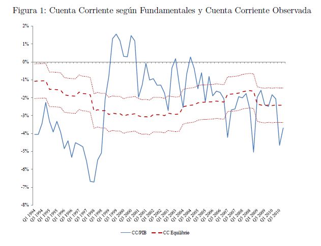 En este artículo estudiamos la estimación de un nivel de equilibrio de la cuenta corriente de la balanza de pagos de Colombia y sus posibles implicaciones para el desalineamiento de la tasa de cambio real. Se siguen dos metodologías alternativas para la estimación. Primero, se realiza una estimación a partir de los determinantes de largo plazo en países emergentes siguiendo a Chinn y Prasad (2003). Segundo, se estima un modelo basado en la teoría del suavizamiento de consumo siguiendo a Ghosh y Ostry (1995). Las implicaciones sobre la tasa de cambio real se basan en el enfoque del balance macroeconómico. Los resultados indican que a fin de 2010 el déficit observado en la cuenta corriente es superior a su nivel de equilibrio. No obstante, encontramos que este resultado corresponde a fluctuaciones cíclicas ya que el componente tendencial de la cuenta corriente es similar a su nivel de equilibrio. Por tanto, el desalineamiento estimado para la tasa de cambio real a fin de 2010 no es significativo estadísticamente.