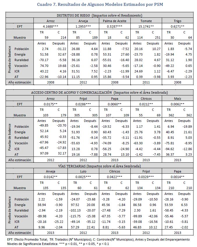 La agricultura ha sido históricamente una actividad prioritaria en Colombia. Su desempeño depende primordialmente de la productividad, la cual parece estar correlacionada con los bienes públicos del sector. En el trabajo se estiman las coberturas de los principales bienes de infraestructura y se evalúan sus efectos sobre el rendimiento y el área sembrada de dieciséis cultivos cosechados en diversas regiones del país. Utilizando modelos de emparejamiento (Propensity Score Matching) se encuentra que el rendimiento de una tercera parte de los cultivos ha sido impactado positivamente por los distritos de riego y drenaje. También revela que el mejor acceso a los centros de acopio y la red de vías terciarias afectan positivamente las áreas sembradas de la 05r parte de los cultivos. Una reasignación de los recursos del Estado hacia la provisión de infraestructura rural es crucial para el desarrollo agrícola del país.