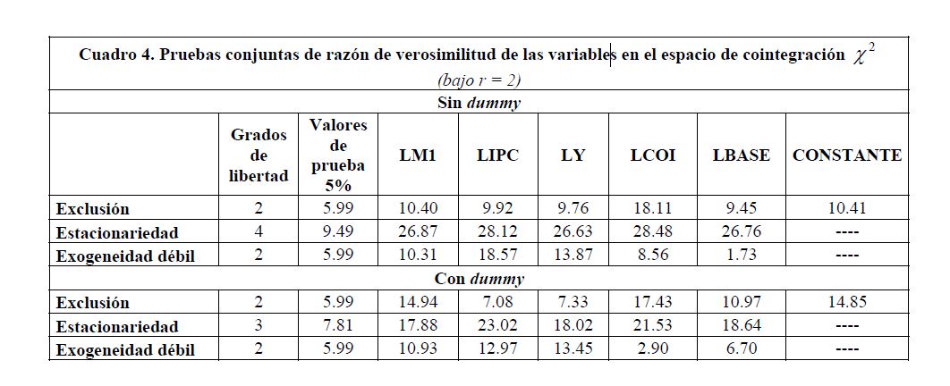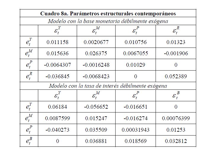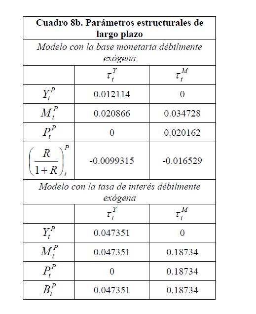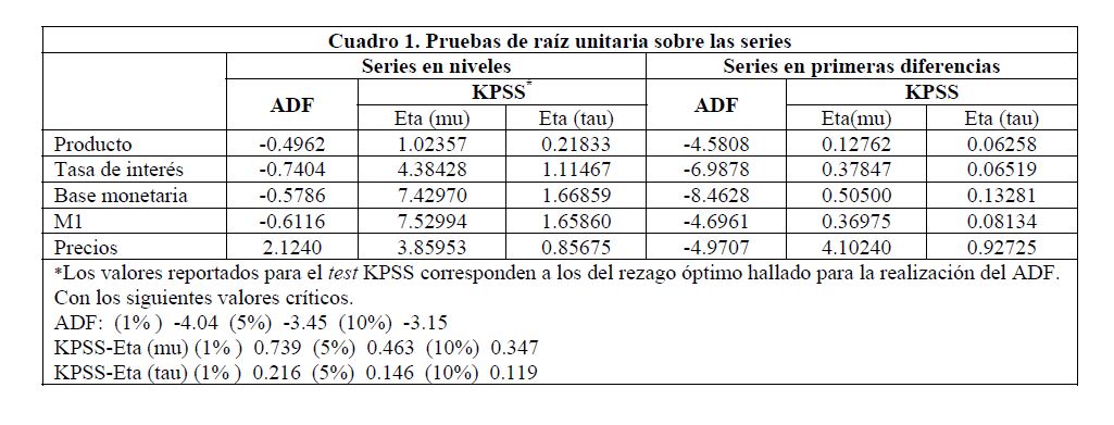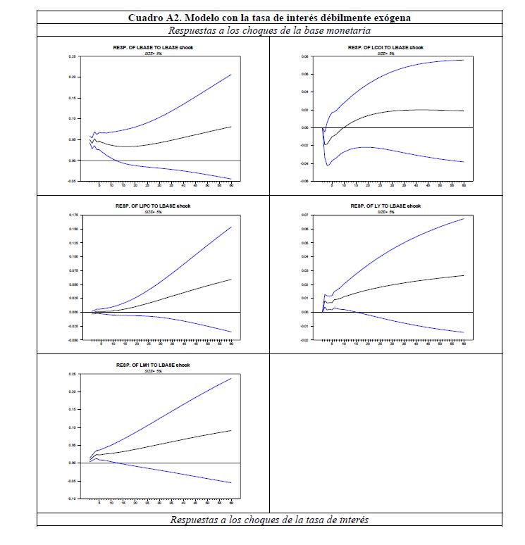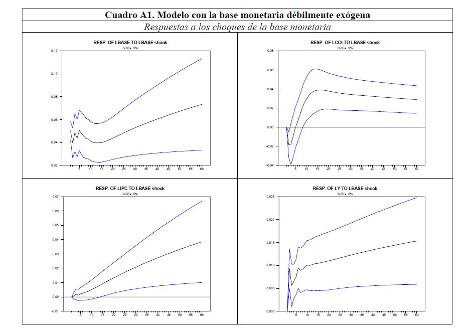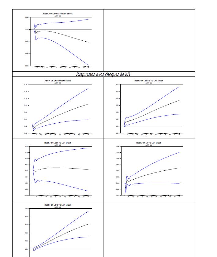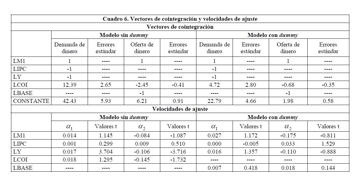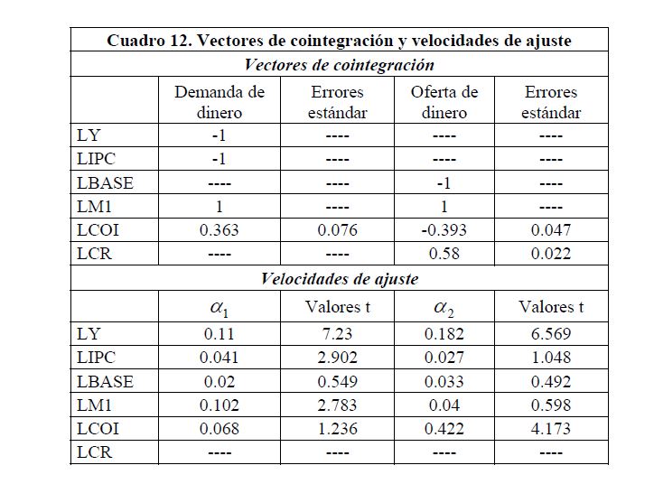 A partir de un esquema de oferta y demanda de dinero se estimó un modelo de relaciones de corto y largo plazo entre cinco variables: base monetaria, dinero (M1), tasa de interés, producto y nivel de precios al consumidor (cifras trimestrales desde 1984:I hasta 2003:IV). El modelo es del tipo denominado SVEC (Structural Vector Error Correction). Los parámetros de las funciones de oferta y demanda de dinero son compatibles con las restricciones teóricas convencionales. La estimación utilizó la metodología de tendencias estocásticas comunes para realizar un análisis de impulsorespuesta y un ejercicio de pronóstico con las posibles variables débilmente exógenas.