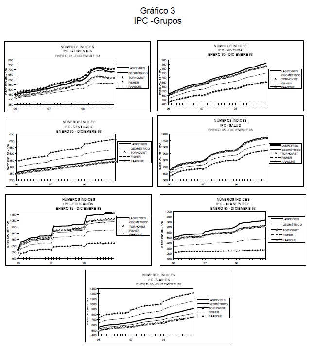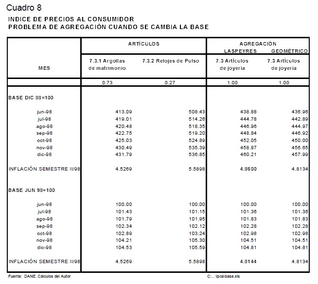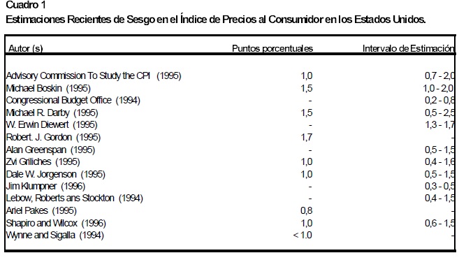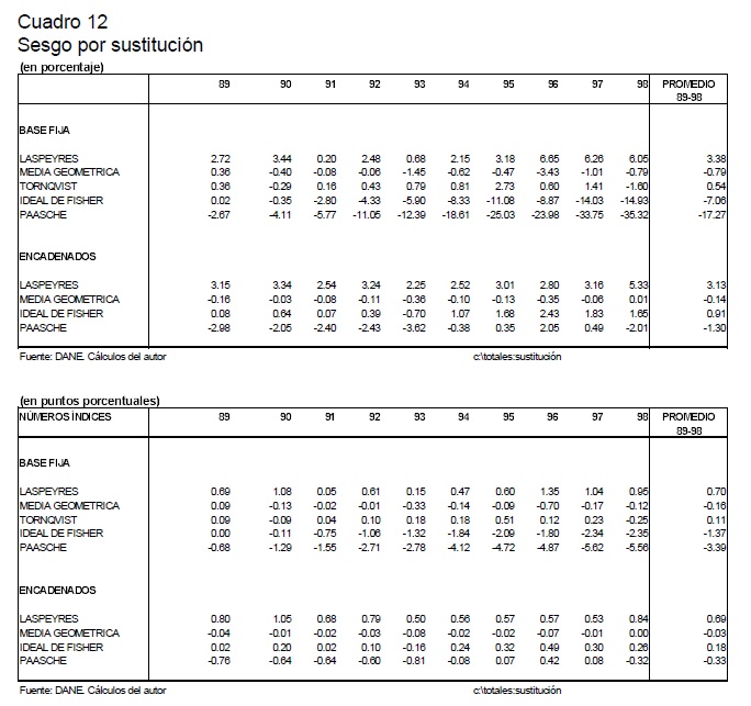 Este trabajo reseña los diferentes sesgos presentes en la medición del IPC en Colombia y cuantifica la magnitud del sesgo por sustitución en el consumo. Para esto último, se computó el IPC con diferentes fórmulas de números índices (Laspeyres, Paasche, media geométrica, Ideal de Fisher y Tornqvist) y se analizó el nivel, la inflación y el sesgo por sustitución. Este último indicador se construyó identificando la diferencia, en porcentaje o en puntos porcentuales, de cualquier índice numérico con respecto a un índice que nos aproxima correctamente a un verdadero Indice de Costo de Vida, en este caso el índice Tornqvist encadenado. Los resultados obtenidos verifican que el índice utilizado por el DANE (Laspeyres) sobrestimó sistemáticamente la inflación al consumidor en 0.7 puntos porcentuales por año en el período 1989-1998, con un rango de sobrestimación que va de 0.2 puntos porcentuales en 1991 a 1.0 puntos en 1997. Adicionalmente, el documento presenta una evaluación de la nueva metodología del IPC del DANE (IPC-98), con el objetivo de identificar las diferentes innovaciones metodológicas incorporadas en la nueva canasta, las cuales permiten corregir o reducir los diferentes sesgos en el cálculo del IPC en Colombia.