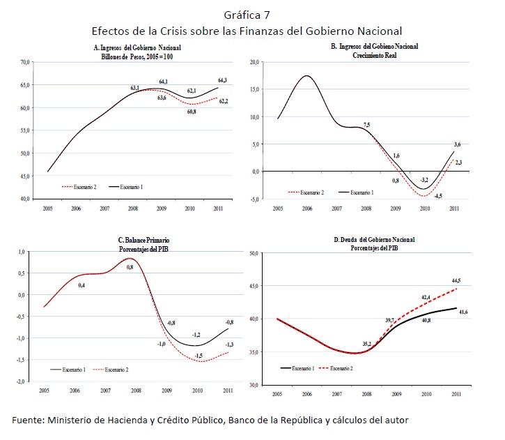 En este documento se caracteriza la política fiscal en Colombia a partir de la valoración de los tres aspectos más relevantes desde la perspectiva macroeconómica: su posición frente al ciclo, su volatilidad y la sostenibilidad de la deuda. Los resultados encontrados se comparan a nivel internacional. Adicionalmente se analiza la postura de la autoridad fiscal frente a la crisis internacional y se evalúan dos escenarios sobre sus posibles repercusiones. Utilizando una regla de política se encuentra que la política discrecional del gobierno ha sido procíclica en el mediano y largo plazo, que ha reducido su volatilidad en los últimos años y que ha sido consecuente con la condición de sostenibilidad. La evidencia indica que hasta ahora la autoridad fiscal no ha diseñado un programa contra-cíclico para compensar los efectos de la crisis y que espera que operen los estabilizadores automáticos en la recuperación para superar los desajustes que se presenten en la actual coyuntura. En el corto y mediano plazo las finanzas del gobierno nacional sufrirán un apreciable deterioro, por la caída en la actividad económica: sus ingresos se podrían contraer, en términos reales, entre -3% y -4,5% en 2010, el balance primario será negativo hasta 2011 (oscilará entre -0,8% y -1,5% del PIB) y la deuda alcanzaría niveles cercanos a los registrados a comienzos de la década.