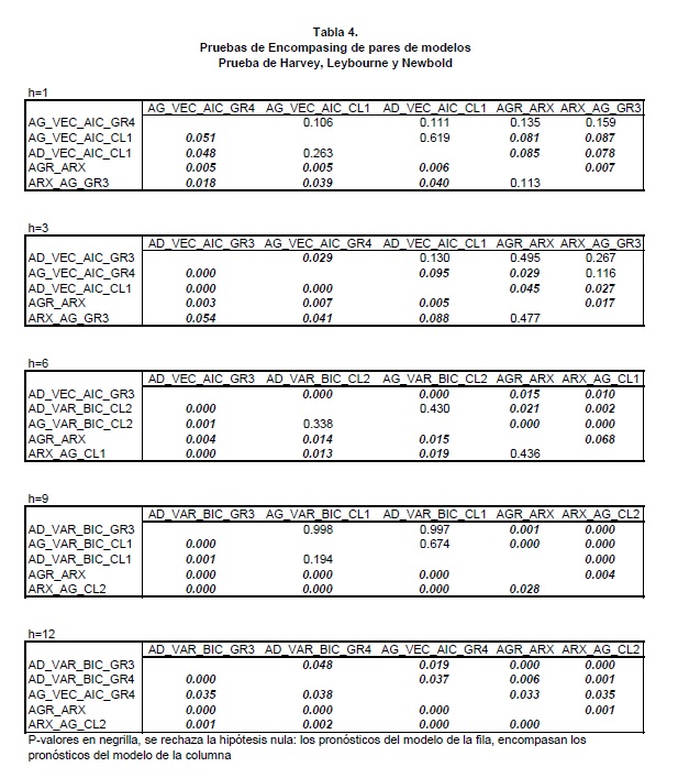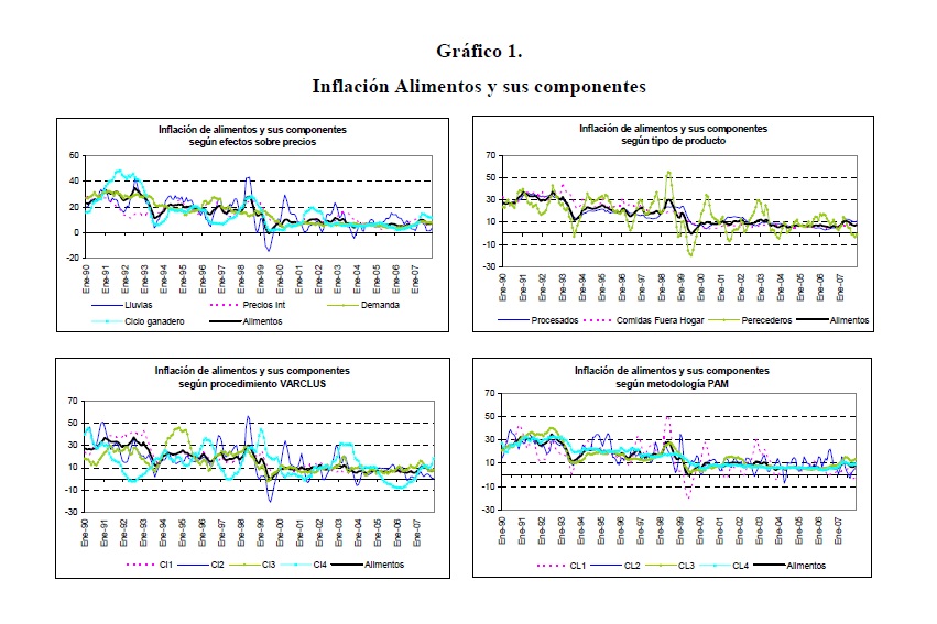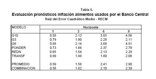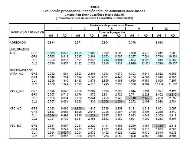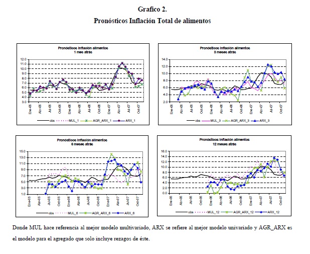 Pronosticar la inflación de alimentos es uno de los grandes retos del Banco central, debido a la alta ponderación de los alimentos dentro del IPC y puesto que los rubros que conforman este grupo obedecen principalmente a factores de oferta que no son fácilmente predecibles ni reaccionan a la política monetaria. En este trabajo se construyen pronósticos para la inflación de alimentos a partir de desagregados, utilizando diferentes clasificaciones de la canasta de alimentos del IPC. Se evalúan y comparan modelos tanto univariados como multivariados según su capacidad de pronóstico. Los resultados muestran, que los pronósticos construidos a partir de pronósticos de subgrupos de alimentos generados por modelos multivariados (VARX y VEC) producen menor error de pronóstico que los generados por un modelo univariado (ARX). De otro lado, para el corto y mediano plazo, los pronósticos para el agregado construidos agregando pronósticos de subgrupos de alimentos producen menor error de pronóstico que los pronósticos para la inflación de alimentos generados por un modelo que contiene tanto rezagos del agregado como rezagos de los subgrupos. Sin embargo, para horizontes más lejanos los segundos parecen mejores que los primeros.