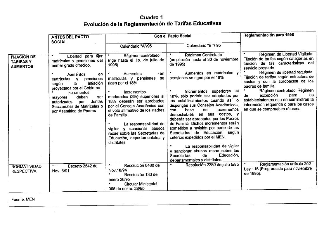 En los últimos años se ha observado un incremento de los precios de la educación privada por encima de la inflación observada. En las décadas recientes la educación básica privada ha sido muy dinámica y hoy atiende un gran número de niños y jóvenes colombianos, pero simultáneamente una buena proporción de estudiantes potenciales no asiste a la educación básica a pesar de pertenecer a hogares que la demandan y cuentan con ingresos suficientes para comprarla en el mercado, esto es, la oferta privada es "inexplicablemente" inélastica. De otro lado, existe evidencia acerca de los beneficios potenciales de mejorar la calidad en la educación - pública y privada - y específicamente por su impacto sobre el logro y la eficiencia -por la reducción de la repitencia y la deserción-. No obstante, en Colombia la capacidad de explicación de la calidad por medio de insumos escolares observables es aun muy limitada. Este artículo busca sopesar las bondades y/o perjuicios de la regulación pública de precios de la educación privada con base en los índices disponibles de calidad escolar. A partir de consideraciones económicas, se concluye que la intención de ejecutivo de promover la calidad por medio de la regulación pública de los precios de la educación privada, en función de un índice de variables observables de calidad puede generar ineficiencia- restricciones de oferta entre otros-, pues genera señales imprecisas de calidad e inhibe la operación de mecanismos competitivos de mercado. Parecería preferible -más eficiente- optar por un esquema regulatorio más sencillo que permitiera la negociación libre de contratos educativo en los primeros grados escolares y, que para la fijación de precios en períodos más avanzados del contrato, definiera mecanismos equitativos de renegociación, donde el regulador público operaría como arbitro ante la eventual inexistencia de acuerdos voluntarios entre las partes. Adicionalmente, para lograr la promoción de la calidad y la operación más eficiente de este esquema de negociación directa padres-colegio, se debería proveer pública y gratuitamente información específica, precisa y comparativa acerca del desempeño o logro de cada colegio en los diferentes niveles educativos.