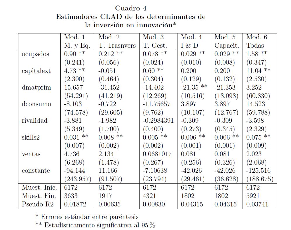Se presenta una revisión de los principales trabajos que analizan, teórica y empíricamente los determinantes de la inversión de las firmas en innovación. Se describen los resultados para la industria manufacturera colombiana, de un modelo Tobit, cuya estimación se lleva a cabo por medio del método CLAD propuesto por Powell (1984). Se concluye que el tamaño de las empresas, la participación del capital extranjero y las bases de conocimiento de las firmas son las principales variables explicativas.