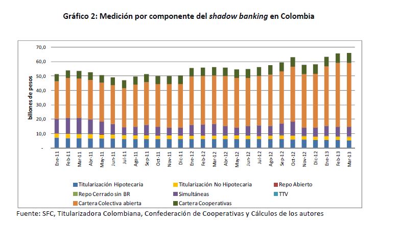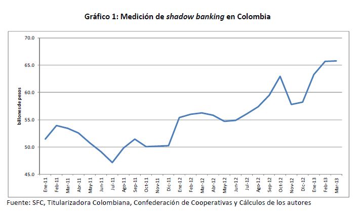 In this study we calculate an indicator of the shadow banking activity in Colombia for the period between January 2011 and March 2013. This indicator suggests that this activity has been increasing, accounting for about 9.9% of GDP in 2012. Additionally,