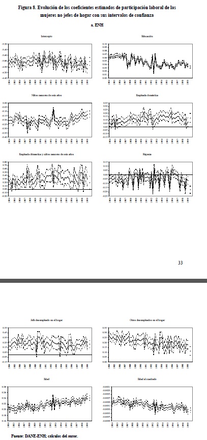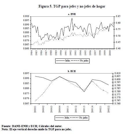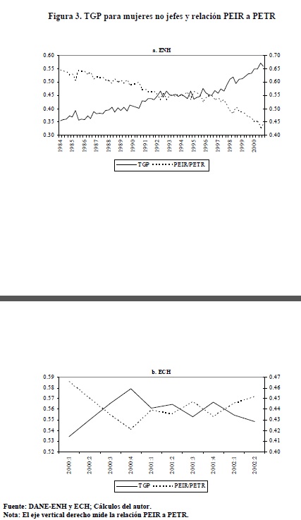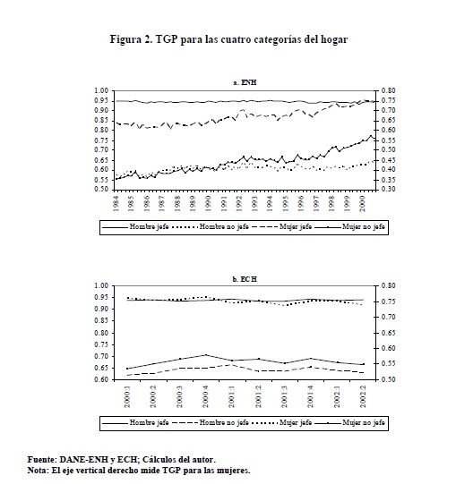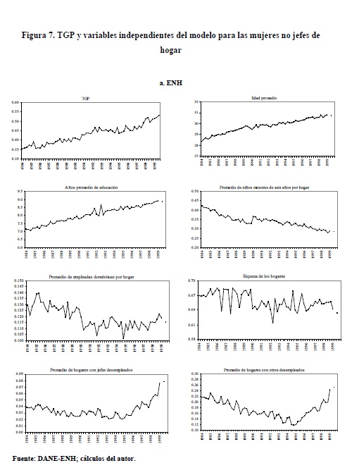 La oferta laboral de las mujeres no jefes de hogar está principalmente asociada a la decisión de participar en el mercado laboral. El caso específico de las mujeres es un tema muy importante en el campo de la economía laboral sobre todo porque su participación en las últimas décadas se ha incrementado de manera importante y este comportamiento no solo se ha dado en el caso colombiano, sino también en las economías más desarrolladas. Un factor importante para las economías en vía de desarrollo, y que se puede asociar al aumento de la participación de las mujeres no jefes de hogar es la existencia del servicio doméstico en el hogar, ya que en economías como la colombiana la tendencia de este tipo de servicio es abundante y no es costoso si se compara con otras economías. Este trabajo se centra en un modelo de participación laboral para el caso específico de las mujeres no jefe de hogar, desde 1984: I hasta 2002: II, con base en la ENH y la ECH del DANE. Los resultados de los ejercicios econométricos muestran que los principales determinantes de efecto positivo son la educación, la edad, la tasa de desempleo y existencia de servicio doméstico en el hogar; los principales determinantes de efecto negativo son la riqueza y la existencia de niños en edades menores. Según el modelo la TGP cae ante disminuciones en la tasa de desempleo y cambios en los programas educativos.