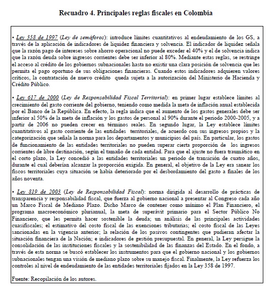 Fiscal rules enhance the credibility of government decisions, allow countries to have contracyclical and sustainable fiscal policies, and contribute to macroeconomic stability and economic growth. The Colombian government has applied them to limit the gro
