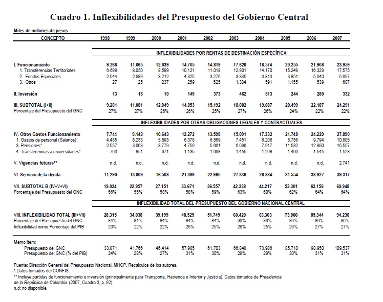 Las reglas fiscales aumentan la credibilidad en la política económica, permiten un manejo fiscal contracíclico y sostenible intertemporalmente, y contribuyen a la estabilidad y al crecimiento económico. El gobierno colombiano ha usado reglas fiscales para limitar el crecimiento del gasto y el endeudamiento de los entes territoriales y para propiciar la transparencia y responsabilidad fiscal del sector público. Sin embargo, el alcance de dichas reglas ha sido limitado, como lo evidencia la naturaleza estructural del desequilibrio fiscal del gobierno central y la procíclicidad de su política. En este documento se formula y evalúa una regla fiscal cuantitativa de 1% del PIB de superávit primario estructural para el gobierno central, con el fin de consolidar el proceso de ajuste de las finanzas públicas del país y blindar su manejo hacia el futuro. La aplicación contrafactual de la regla muestra que si se hubiera adoptado a comienzos de la década, el gobierno hubiera hecho ahorros anuales de por lo menos 0,7% del PIB entre 2001 y 2006. Si se acogiera este año, se lograrían ahorros del mismo monto entre 2008 y 2011, con lo cual se reduciría el nivel actual de la deuda en 3 puntos del PIB al final del período.