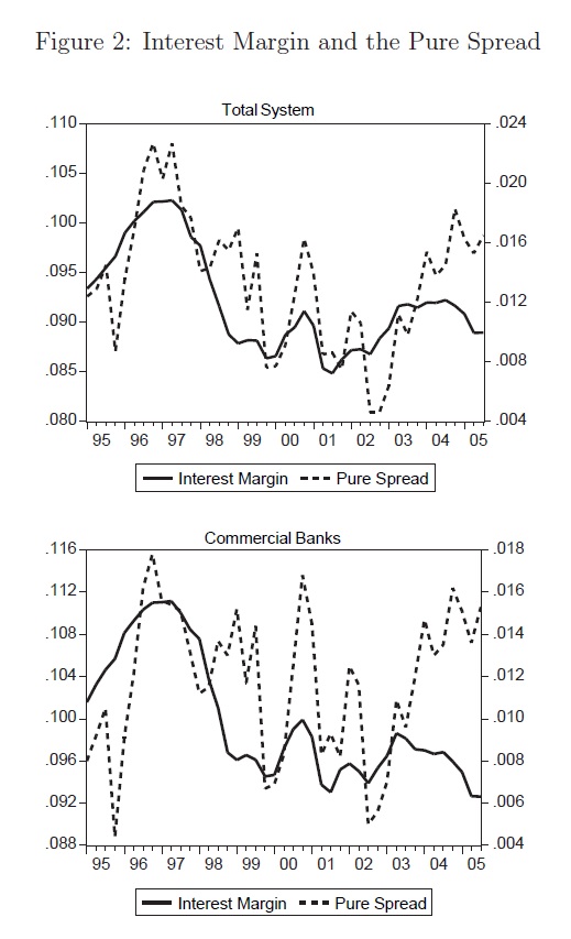 This paper analyzes the determinants of interest margins in the Colombian Financial System. Based on the model by Ho and Saunders (1981), interest margins are modelled as a function of the pure spread and bank-specific institutional imperfections using qu