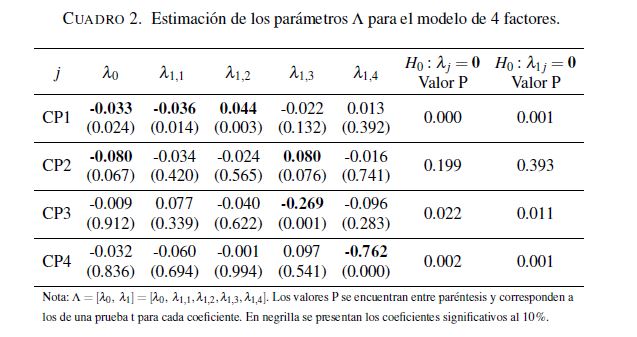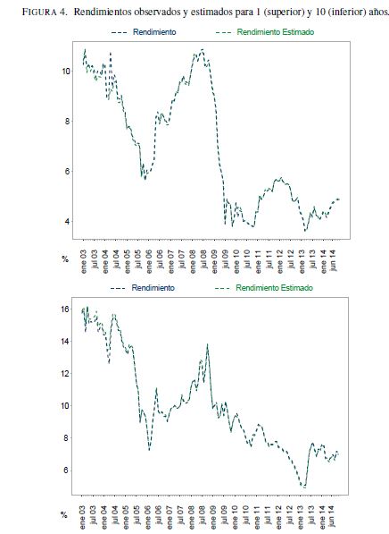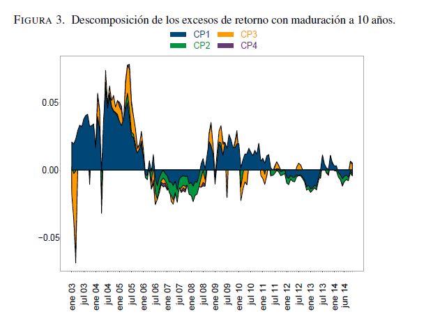 Se estima la prima por vencimiento a partir de un modelo afín de 4 componentes principales de la estructura a términos de las tasas de interés de los bonos soberanos de Colombia en pesos. Se sigue la metodología propuesta por Adrian et al. (2013) para el periodo comprendido entre 01 de 2003 y octubre de 2014. Los resultados obtenidos indican que la prima por término es 05r y más volátil a medida que aumenta el vencimiento. También se observa que esta prima es decreciente en el tiempo, lo cual se puede asociar a las mejores condiciones del mercado de estos títulos, la 05r estabilidad macroeconómica y las 05res condiciones de liquidez a nivel internacional. Adicionalmente, el modelo estimado captura eventos de estrés observados en el mercado.