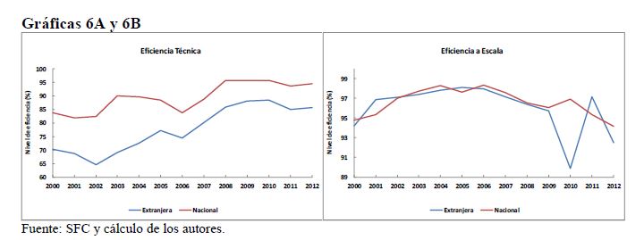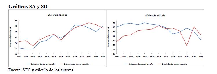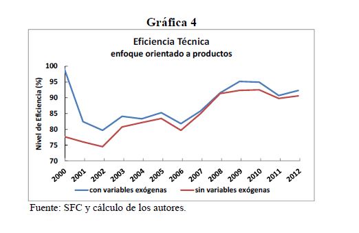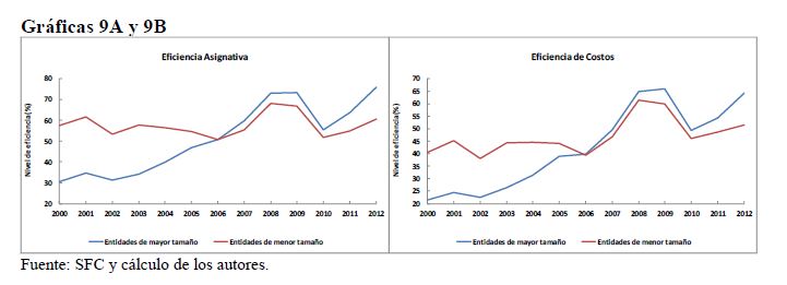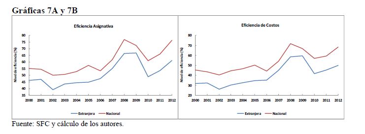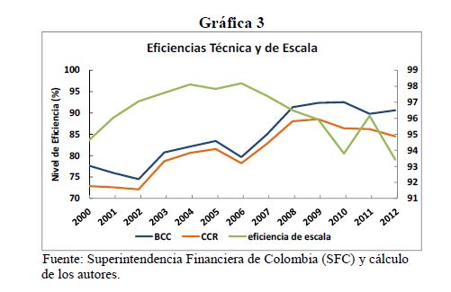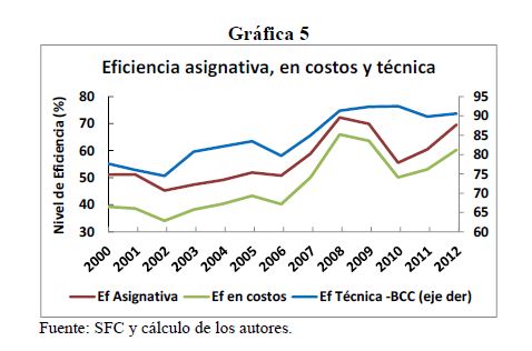 This paper analyzes the technical, scale, cost and allocative efficiency of the Colombian banking system during 2000-2012, by using the DEA methodology (Data Envelopment Analysis). This is based on individual production functions of the entities that comp