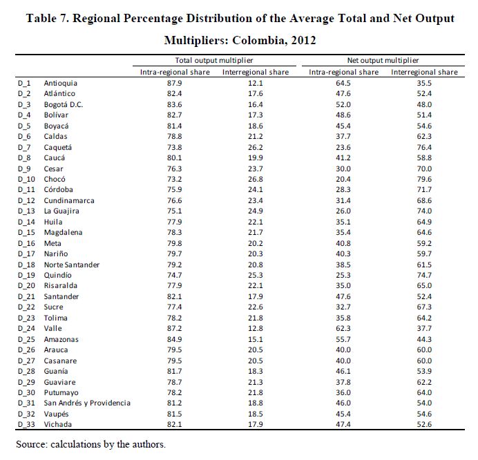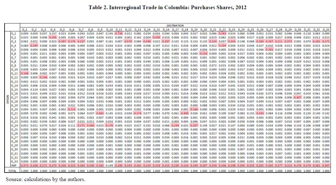 Interregional input-output matrix for Colombia, 2012