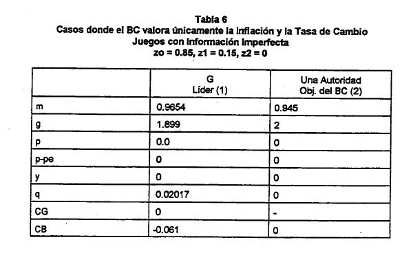 Los resultados de estas simulaciones resaltan el hecho de que los supuestos sobre la distribución de la información entre el G, el BC y el sector privado son cruciales en la determinación de la inflación y la tasa de cambio real de equilibrio. Al mismo tiempo, se presentan algunos indicios sobre las condiciones bajo las cuales el G. y el BC encuentran mutuamente provechoso coordinar sus políticas. Finalmente, los ejemplos muestran que para reducir la inflación, la estabilidad de precios debe ser el primordial (o único) objetivo del BC, y que si el BC ha de reducir la inflación y alcanzar una meta de tasa de cambio real al mismo tiempo, es necesario que el G no se encuentre en una posición inicial ventajosa (i.e. se necesita un BC altamente independiente). (1) Suponiendo que existe una asimetría entre la información de que se disponen el Banco y el Gobierno por un lado, y el sector privado por el otro, el mismo autor demuestra que el grado de independencia del BC tiene varias implicaciones sobre la distribución de la inflación (su media y varianza), y sobre la credibilidad de que goza el sector público como un todo entre los agentes privados. En general, entre menor es la independencia del BC, mayor la variabilidad de la inflación, menor la credibilidad de la política económica y, en algunas circunstancias, mayor la medida de la inflación.