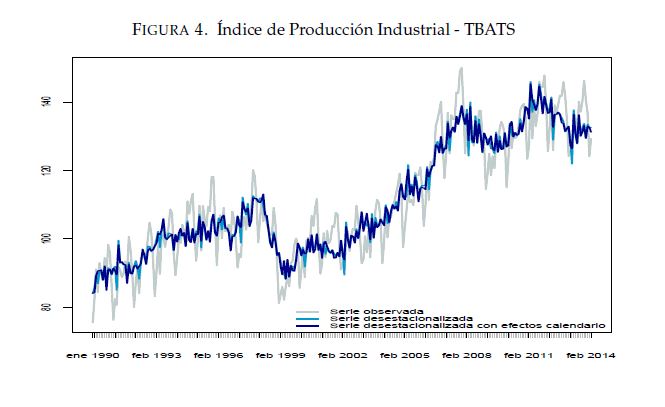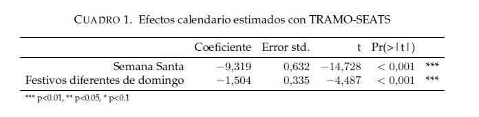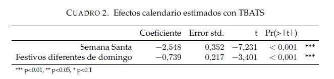| dc.description | Este documento estima los efectos calendario sobre la industria manufacturera en Colombia para el periodo comprendido entre 01 de 1990 y 02 de 2014. Para ello, se implementaron las metodologías de TRAMO-SEATS de Gómez y Maravall [1994, 1996] y TBATS de De~Livera et al. [2011]. Los resultados muestran que los efectos calendario sobre la industria son significativos, siendo el más relevante la semana santa. Aunque en ambos métodos los coeficientes asociados a dichos efectos impactan negativamente la producción industrial, en TRAMO-SEATS la magnitud de ellos es 05r que la estimada por TBATS. Se encuentra que la diferencia entre las tasas de crecimiento anual de los métodos cuando se modelan los efectos calendario respecto a la serie original son, en promedio, 1,36% para el primero y 2,82% para el segundo. Por último, la semana santa tiene un impacto promedio de 5,13% y 4,60 %, respectivamente. | spa |