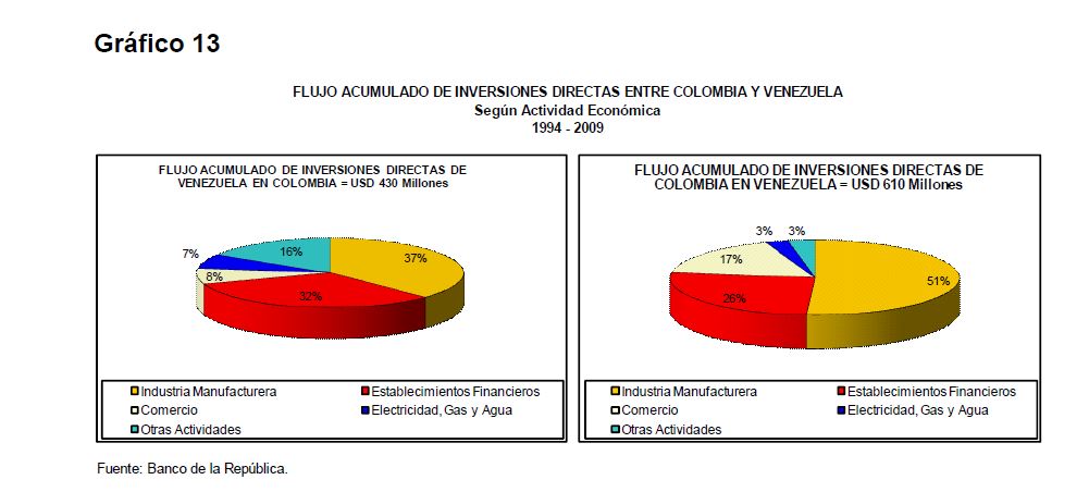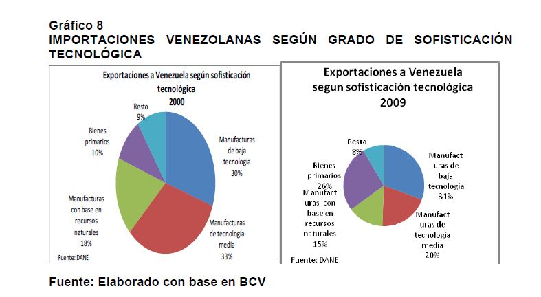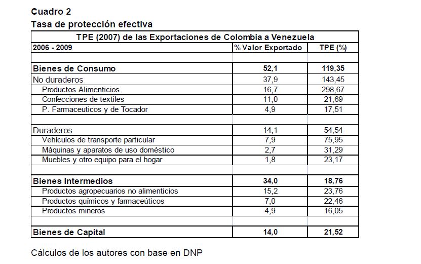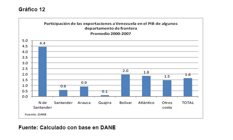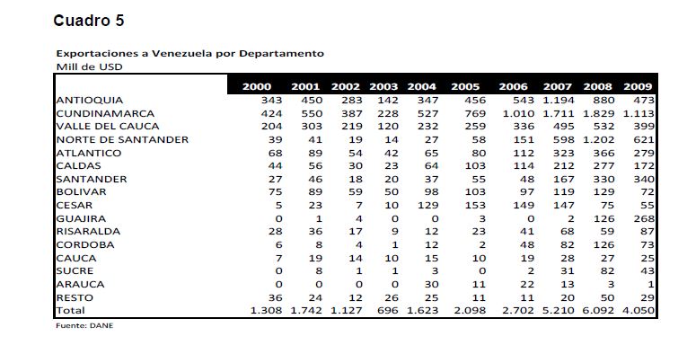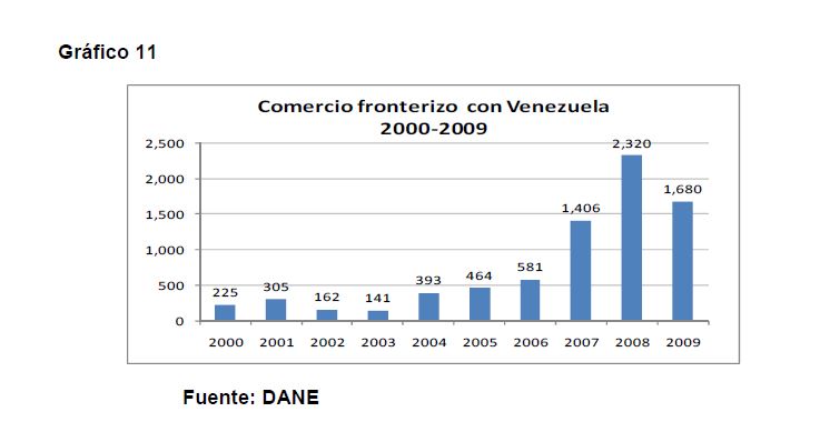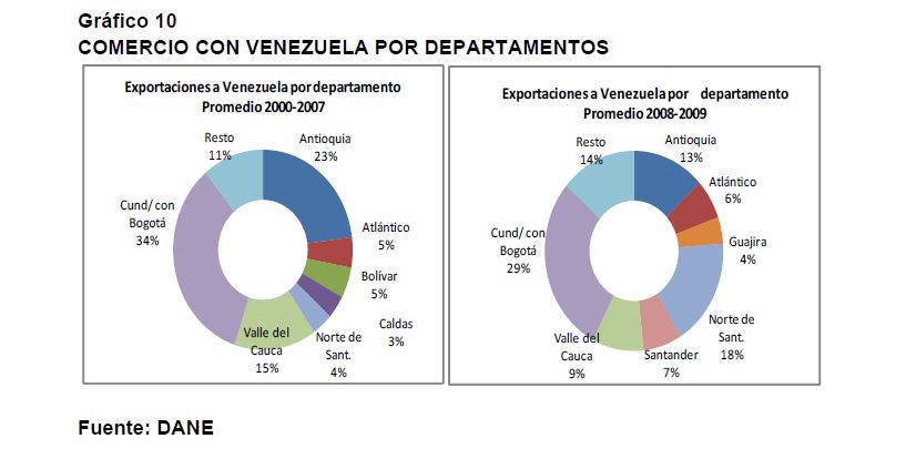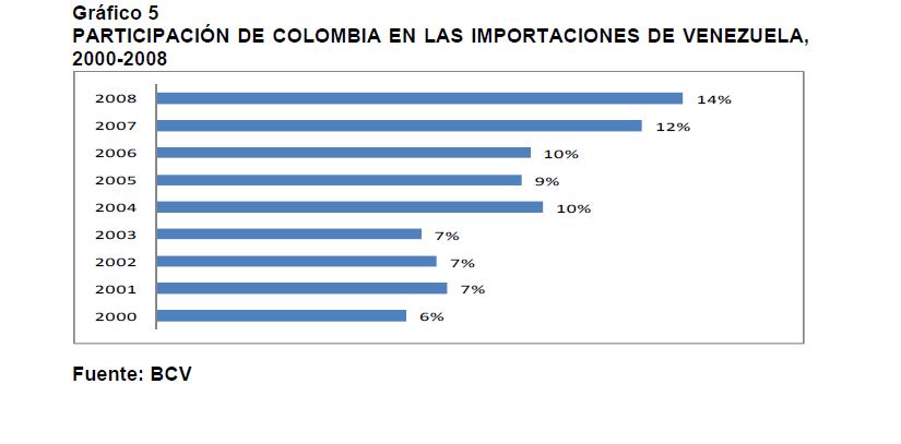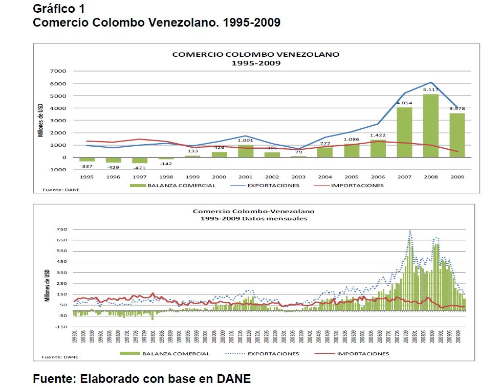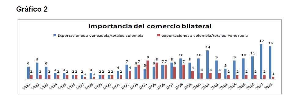 El comercio colombo-venezolano ha experimentado desde los años setenta varias fases de auge y crisis, pero su etapa de crecimiento más importante fue la registrada entre 2004 y 2009. Este crecimiento del comercio se dio en respuesta de una serie de políticas y acontecimientos económicos a ambos lados de la frontera. En Venezuela, fueron determinantes las políticas del Presidente Chávez que han llevado a una transformación productiva de Venezuela y la burbuja de consumo experimentada por el auge de los precios del petróleo. En el caso de Colombia, no debe despreciarse el papel que han tenido las políticas económicas que, sin que sea totalmente evidente, han privilegiado la producción de bienes de consumo a través de 05r protección efectiva mediante aranceles altos. Fueron estas políticas que también permitieron que el desarrollo del comercio bilateral en este último período fuera un proceso de más "desviación" que "creación" de comercio. Esto hace que la sustitución de mercados que Colombia requiere para disminuir su dependencia no sea fácil e inmediata. El impacto final de la caída del comercio con Venezuela en el largo plazo sería de una pérdida de exportaciones reales para Colombia de 3,08% y del PIB de 1,01. En Venezuela, por su parte los impactos sobre las ventas y el PIB serían 05res.