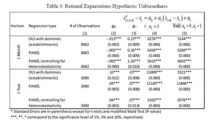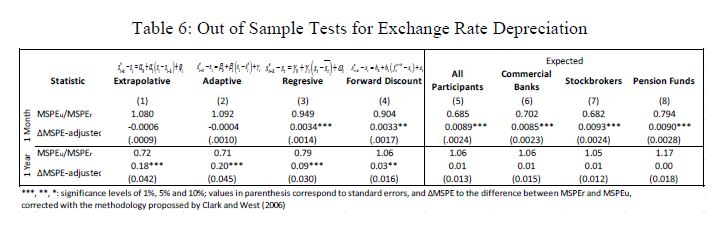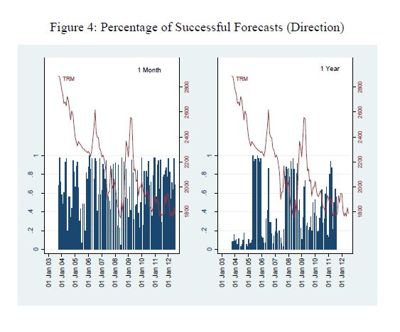 Se utiliza en este documento la Encuesta de Expectativas realizada mensualmente por el Banco de la República entre Octubre de 2003 y Agosto de 2012. Se encuentra que las revaluaciones de la tasa de cambio llevaron a expectativas de nuevas revaluaciones en el corto plazo (1 mes), pero a expectativas de devaluación en el largo plazo (1 año), y que las expectativas son estabilizadoras tanto en el corto como en el largo plazo. La tasa de cambio forward es en general diferente de la tasa spot en el futuro, principalmente pues los errores de pronóstico son en promedio diferentes de zero. Esto sugiere que las expectativas de tasa de cambio no son racionales. El papel del riesgo cambiario también es importante, sin embargo, siendo estadísticamenente significativo a 1 año (no a 1 mes). Las expectativas a 1 mes resultan mejor para predecir que los modelos de expectativas extrapolativas, adaptativas o regresivas, o que la tasa de cambio forward, y todas ellas superan las predicciones de una caminata aleatoria. Pero los resultados a 1 año son prácticamente opuestos. En este caso los traders y analistas pronosticarían mucho mejor utilizando modelos simples o incorporando en sus proyecciones algunas variables conocidas.