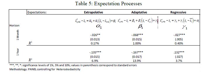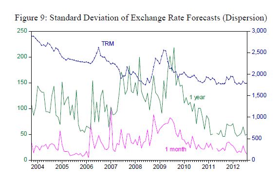 In this document we use the Expectations Survey conducted monthly by the Central Bank of Colombia during the period of October 2003 – August 2012. We find that exchange rate revaluations were generally followed by expectations of further revaluation in th